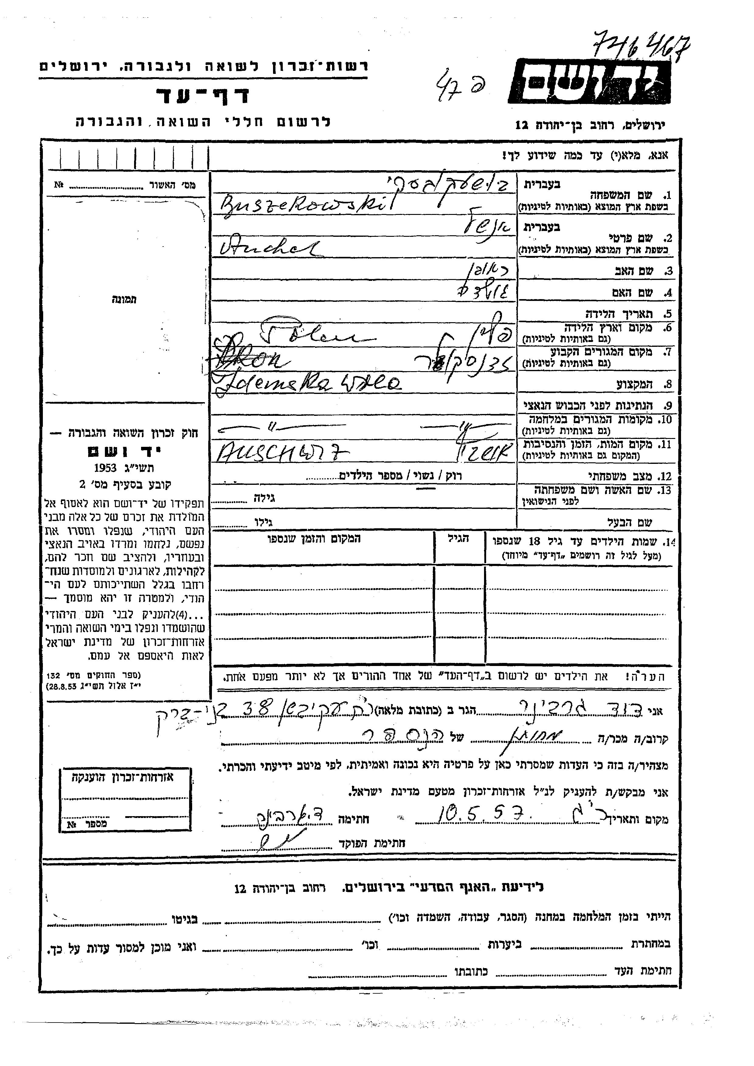 Анчел Buszekowski, место рождения: Польша. Отец: Реувен, mать:Голда. Женат / замужем. Место жительства до войны: Здуньска-Воля, Польша. Место во время войны: Здуньска-Воля, Польша.