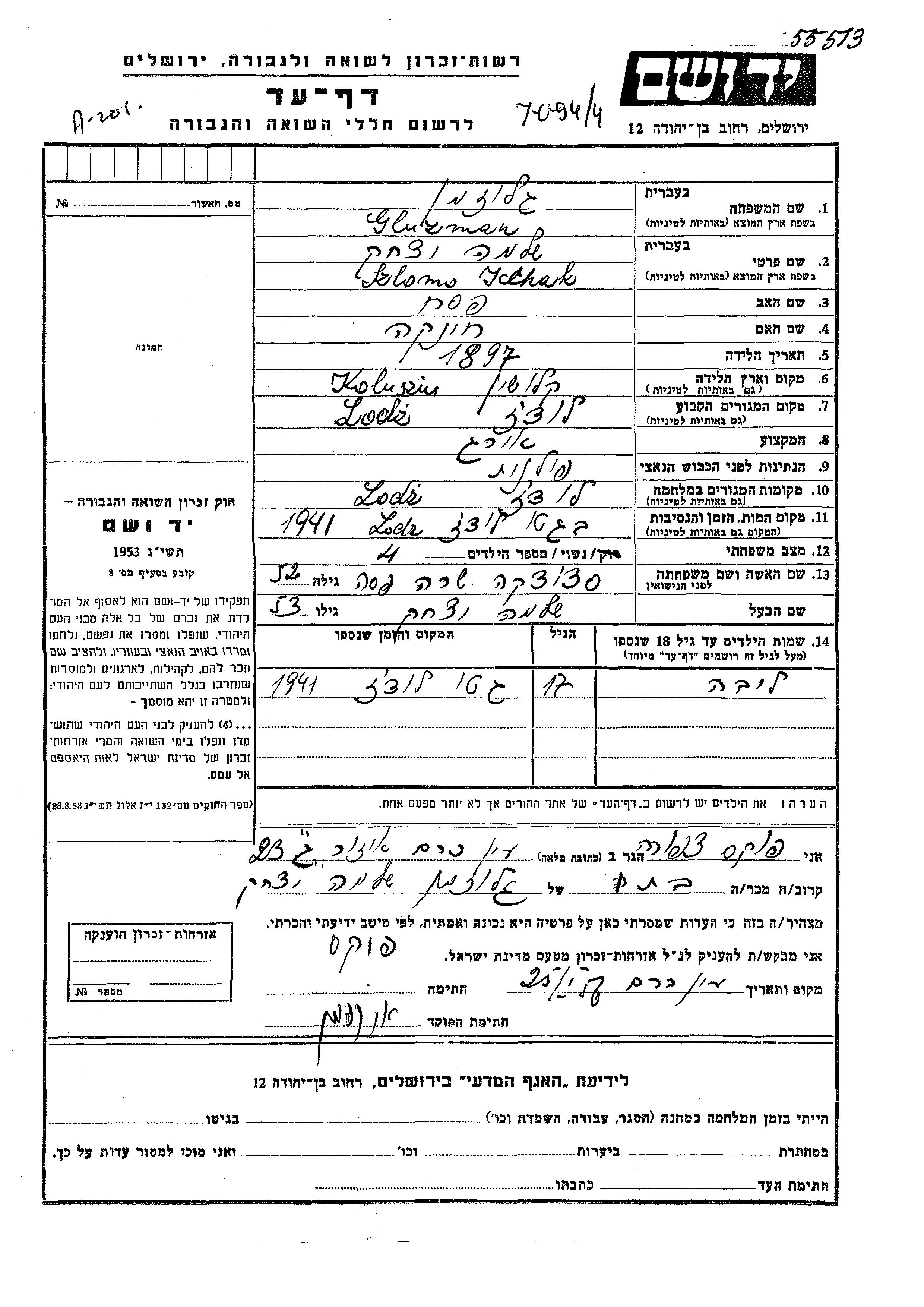 Шломо Ицхак Глузман, место рождения: Калушин, Польша. Отец: Песах, mать:Хинка. Ткач / ткачиха. Женат / замужем. Место жительства до войны: Лодзь, Польша. Место во время войны: Лодзь, Польша.