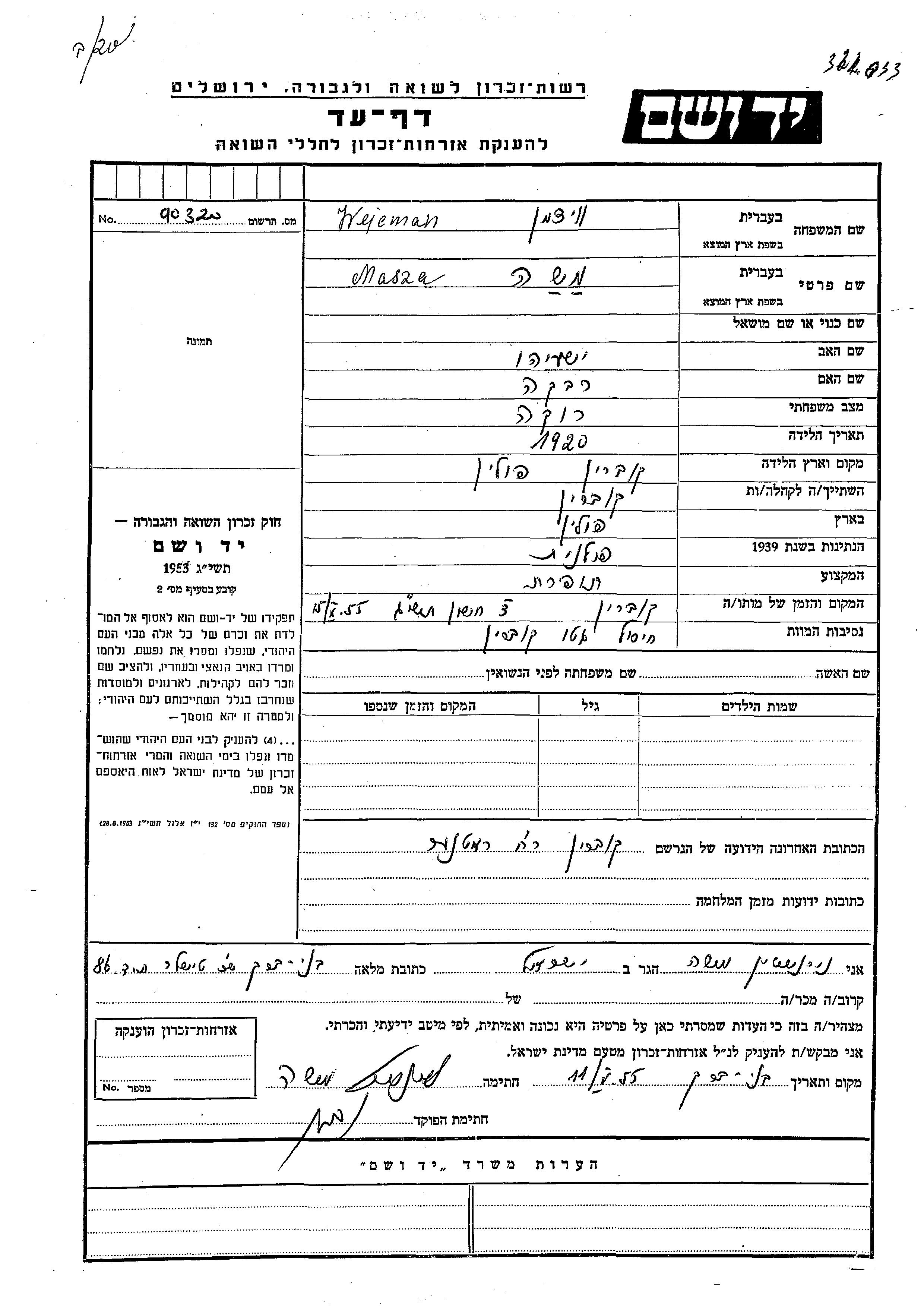 Вейцман Маша Моше 1920 Кобрынь, Польша Лист свидетельских показаний