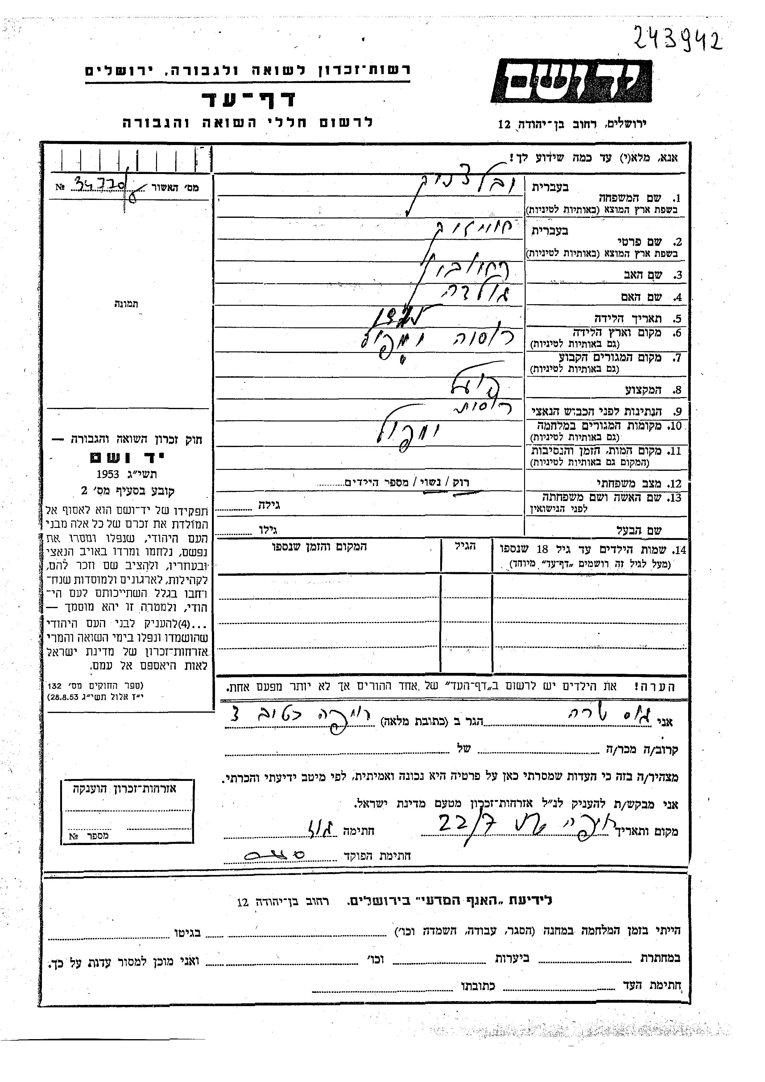 Яд Вашем - Листы свидетельских показаний Мемориального фонда