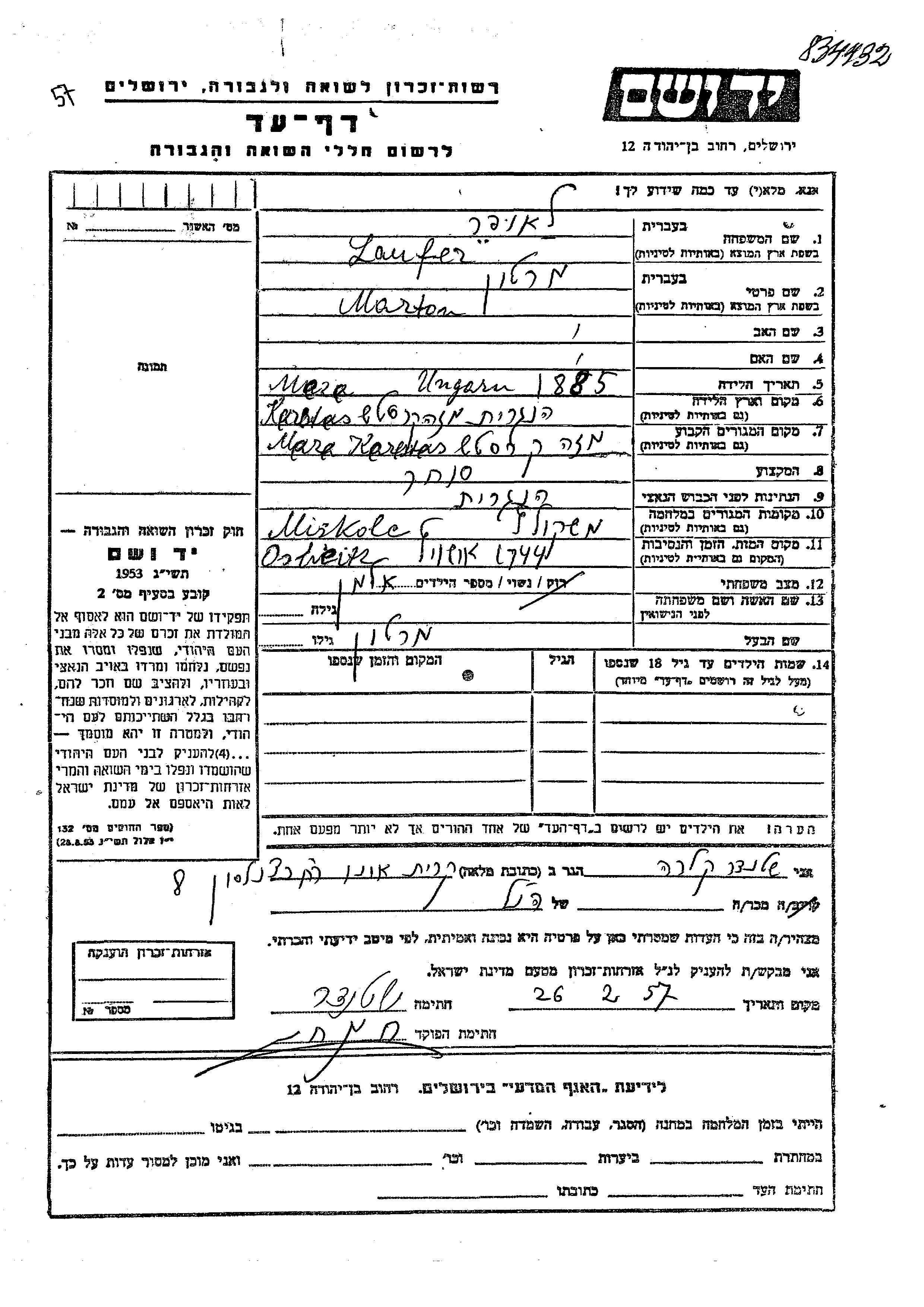 Мартон Лауфер, место рождения: Мезё Керестеш, Венгрия. Торговец / торговка. Вдовец. Место жительства до войны: Мезё Керестеш, Венгрия. Место во время войны: Мишкольц, Венгрия.