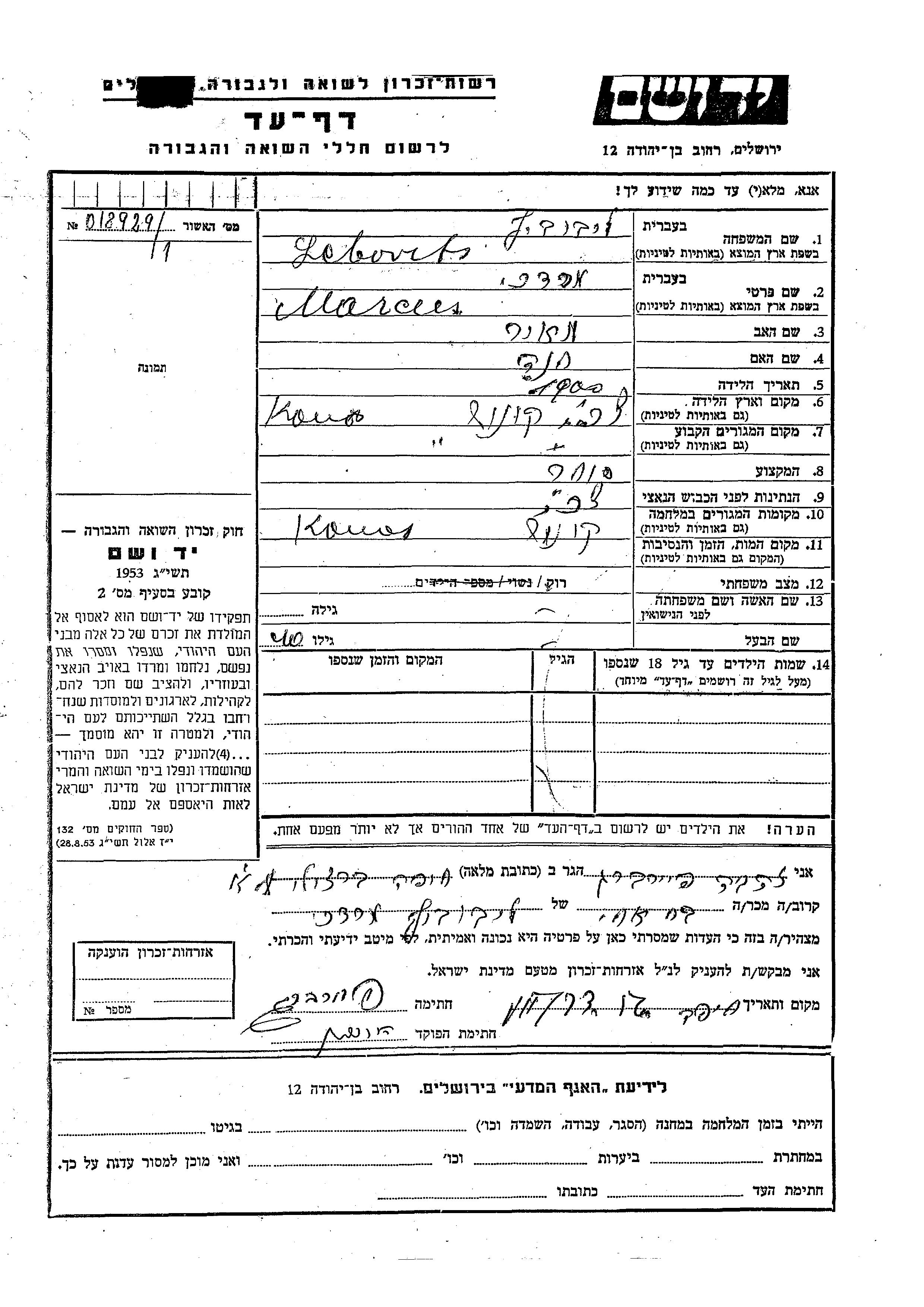 Маркус Мордехай Лебовиц, место рождения: Канора, Чехословакия. Отец: Меир, mать:Хана. Торговец / торговка. Холост / не замужем. Место жительства до войны: Канора, Чехословакия. Место во время войны: Канора, Чехословакия.