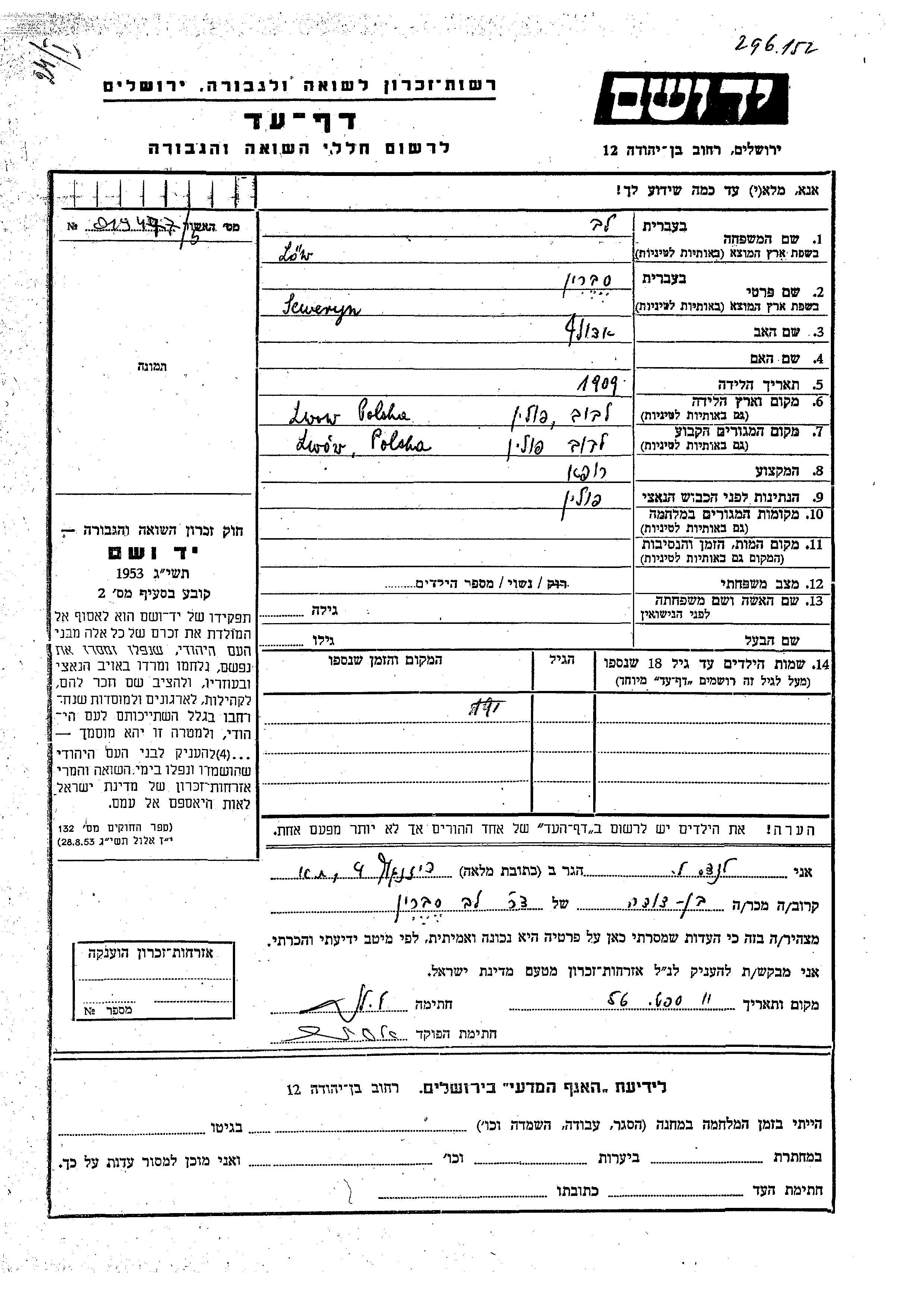 Др. Северин Лов, место рождения: Львов, Польша. Отец: Адольф. Врач. Женат / замужем. Место жительства до войны: Львов, Польша.