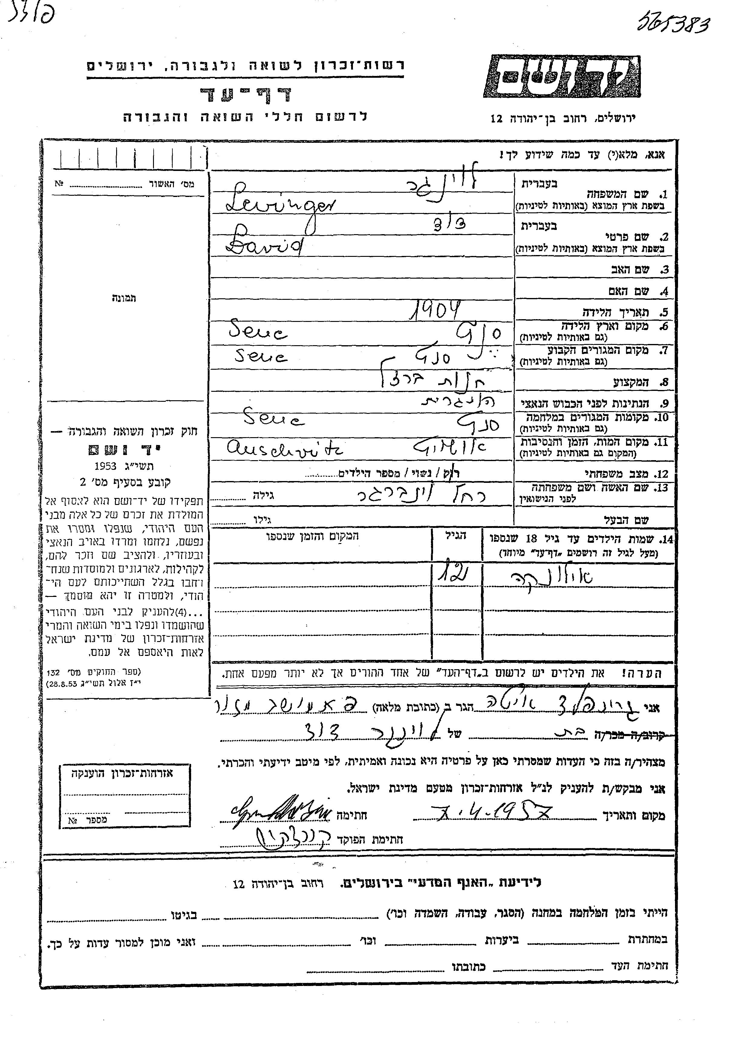Левингер Давид 1904 Сенц, Чехословакия Лист свидетельских показаний