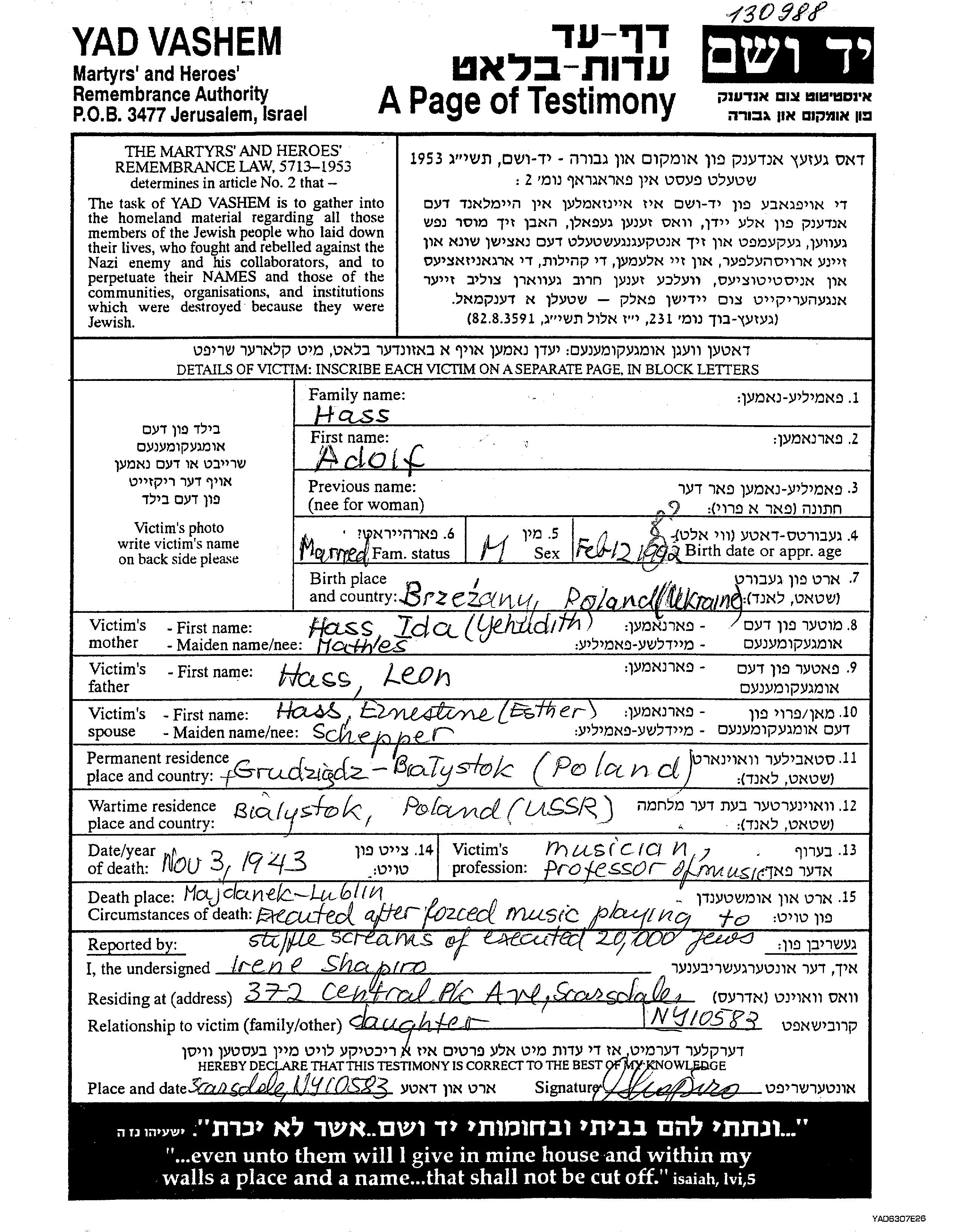 Адольф Хасс Хес, место рождения: Бережаны, Польша. Отец: Леон, mать:Ида Егудит, девичья фамилия Матес Матиас. Музыкант / музыкантша. Женат / замужем. Место жительства до войны: Грудзёндз, Польша. Место во время войны: Белосток, Польша.