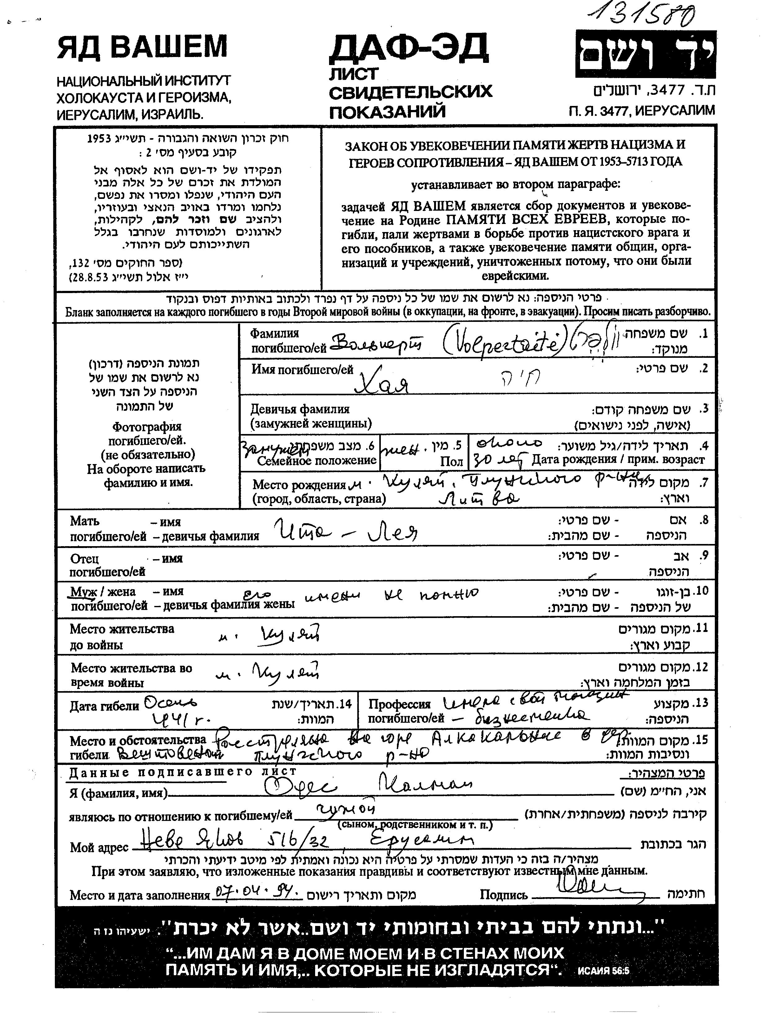 Поиск подателя Листа свидетельских показаний. Поиск по любому имени, включая уменьшительное или прозвище