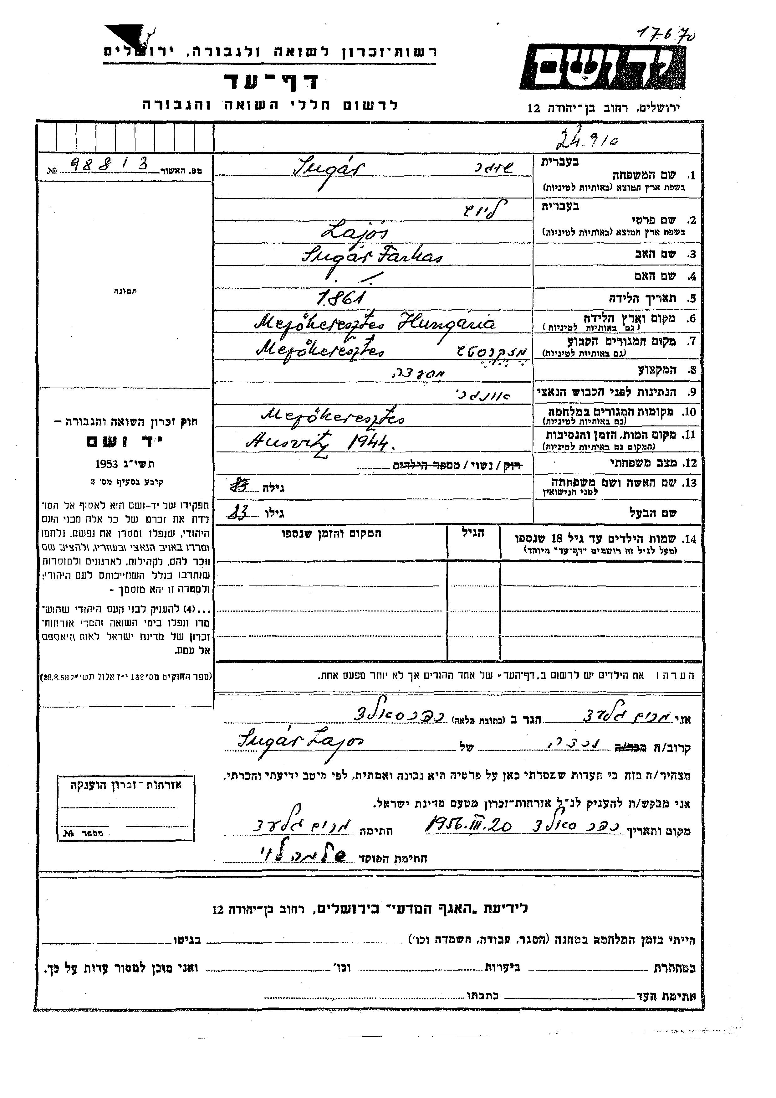 Лайош Сугар, место рождения: Мезёкерестеш, Венгрия. Отец: Фаркаш. Женат / замужем. Место жительства до войны: Мезёкерестеш, Венгрия. Место во время войны: Мезёкерестеш, Венгрия.