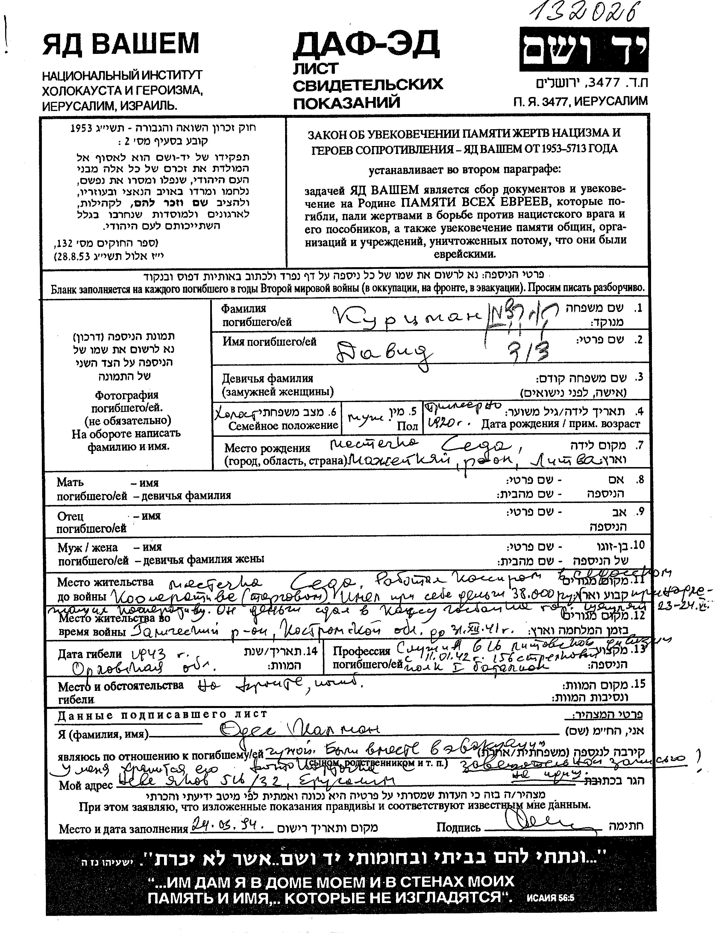 Давид Курцман, место рождения: Седа, Литва. Кассир. Холост / не замужем. Место жительства до войны: Седа, Литва. Место во время войны: Вооруженные силы Советского Союза. Давид погиб на военной службе. место смерти: Орёл, Россия (СССР) в 1943.