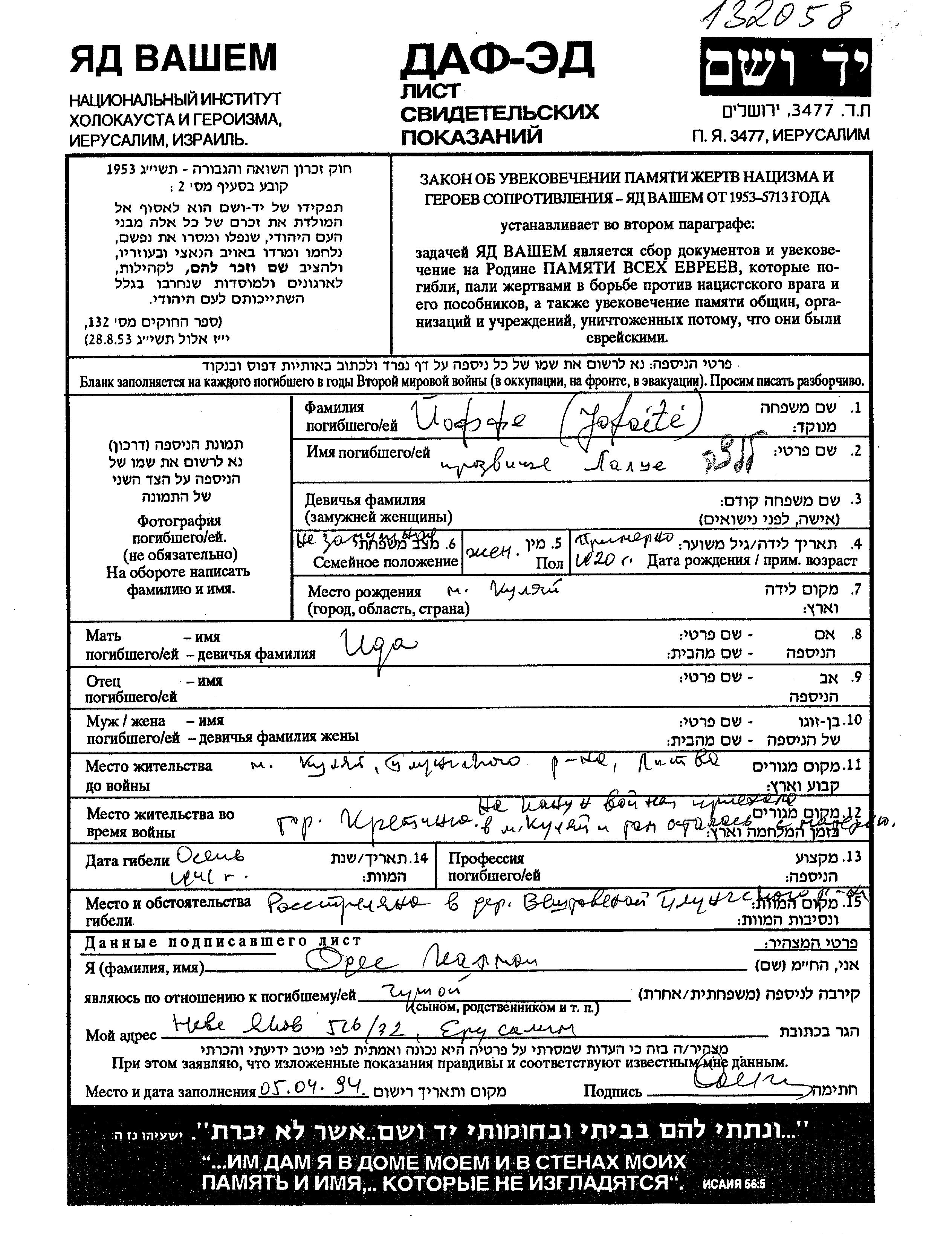 Яд Вашем - Листы свидетельских показаний Мемориального фонда