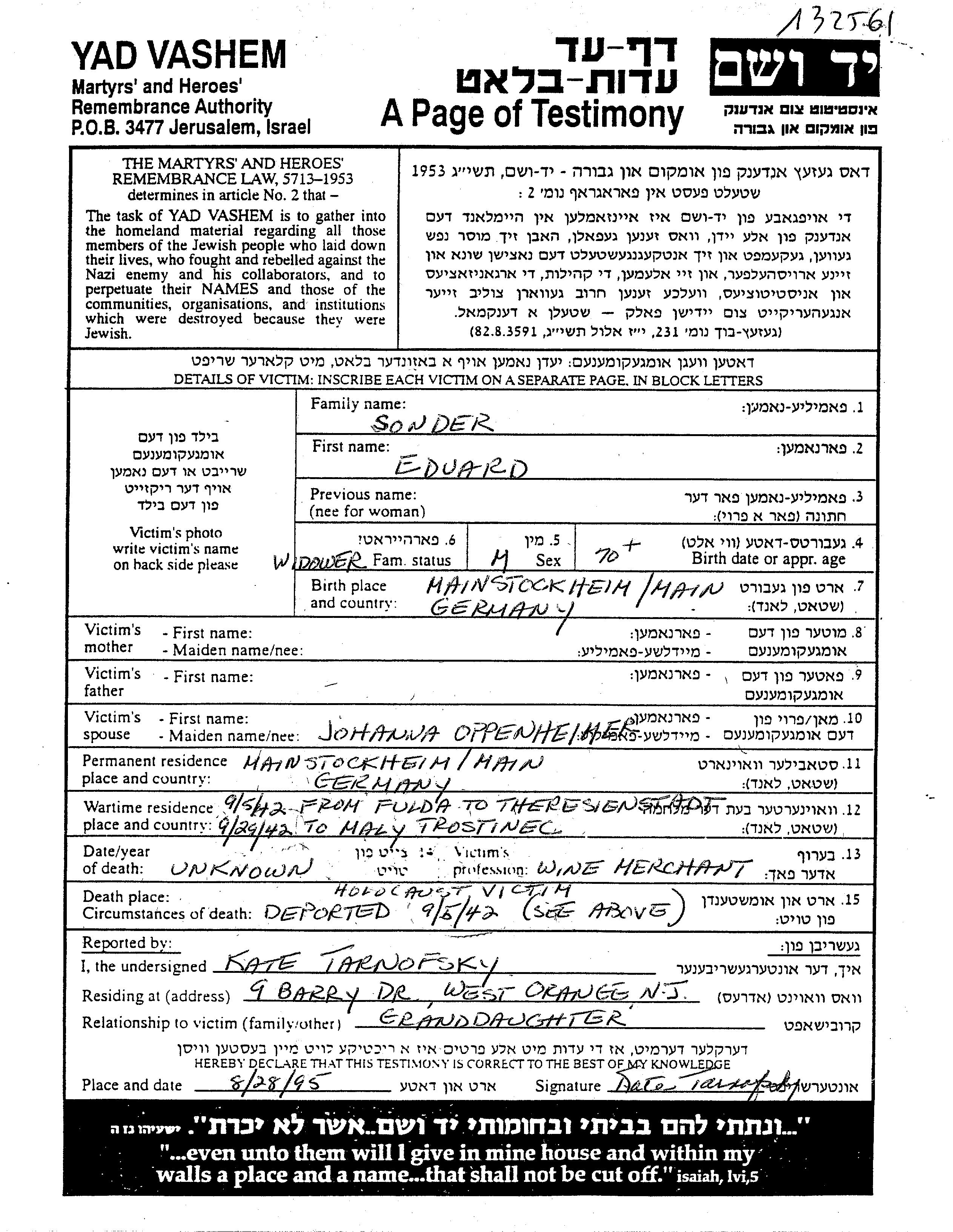 Эдуард Сондер Зондер, место рождения: Майнштокхейм, Германия. Торговец / торговка. Вдовец / вдова. Место жительства до войны: Майнштокхейм, Германия. Место во время войны: Фульда, Германия.
