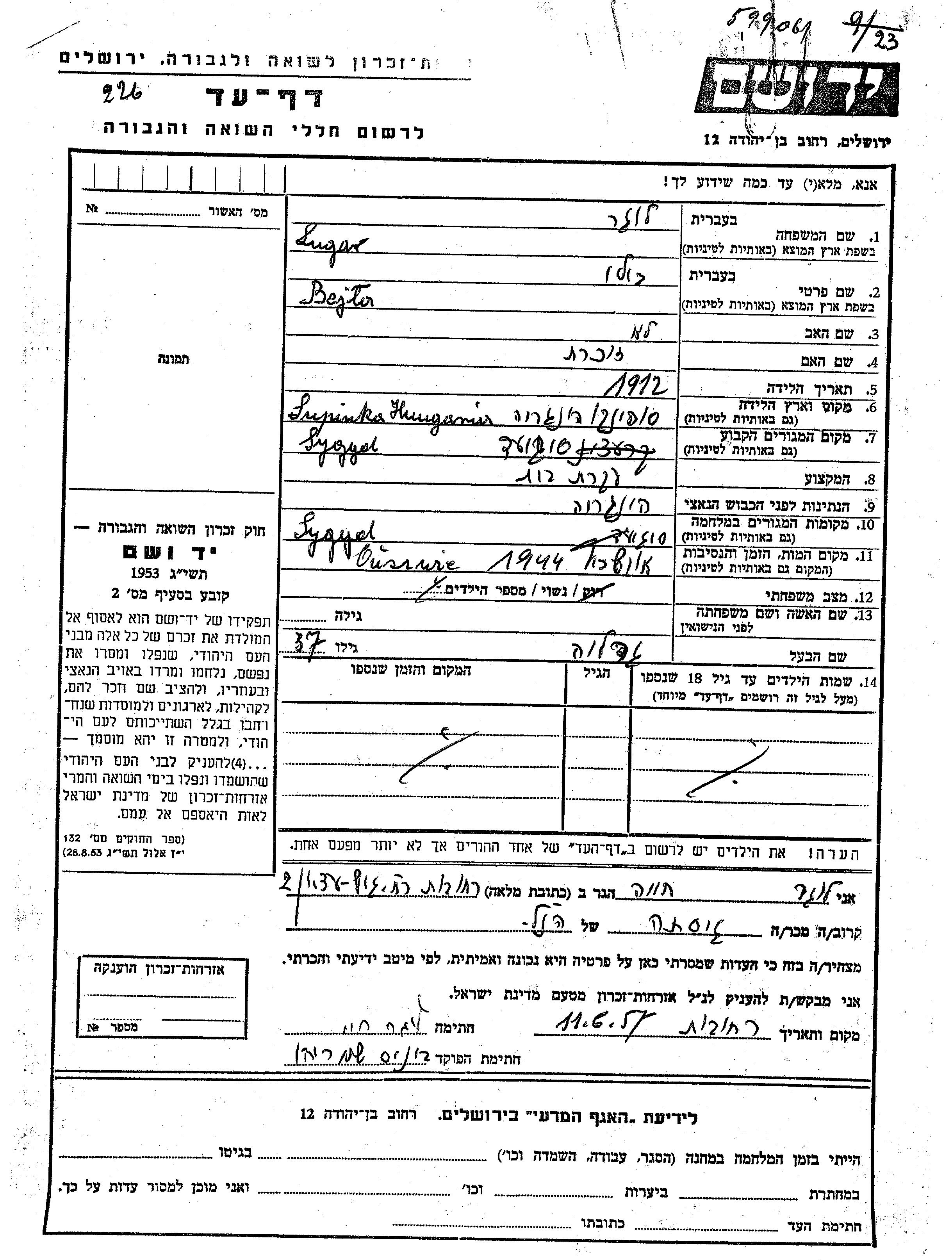 Бейла Лугар, место рождения: Сапинка, Румыния. Домохозяйка. Женат / замужем. Место жительства до войны: Сегед, Венгрия. Место во время войны: Сегед, Венгрия.