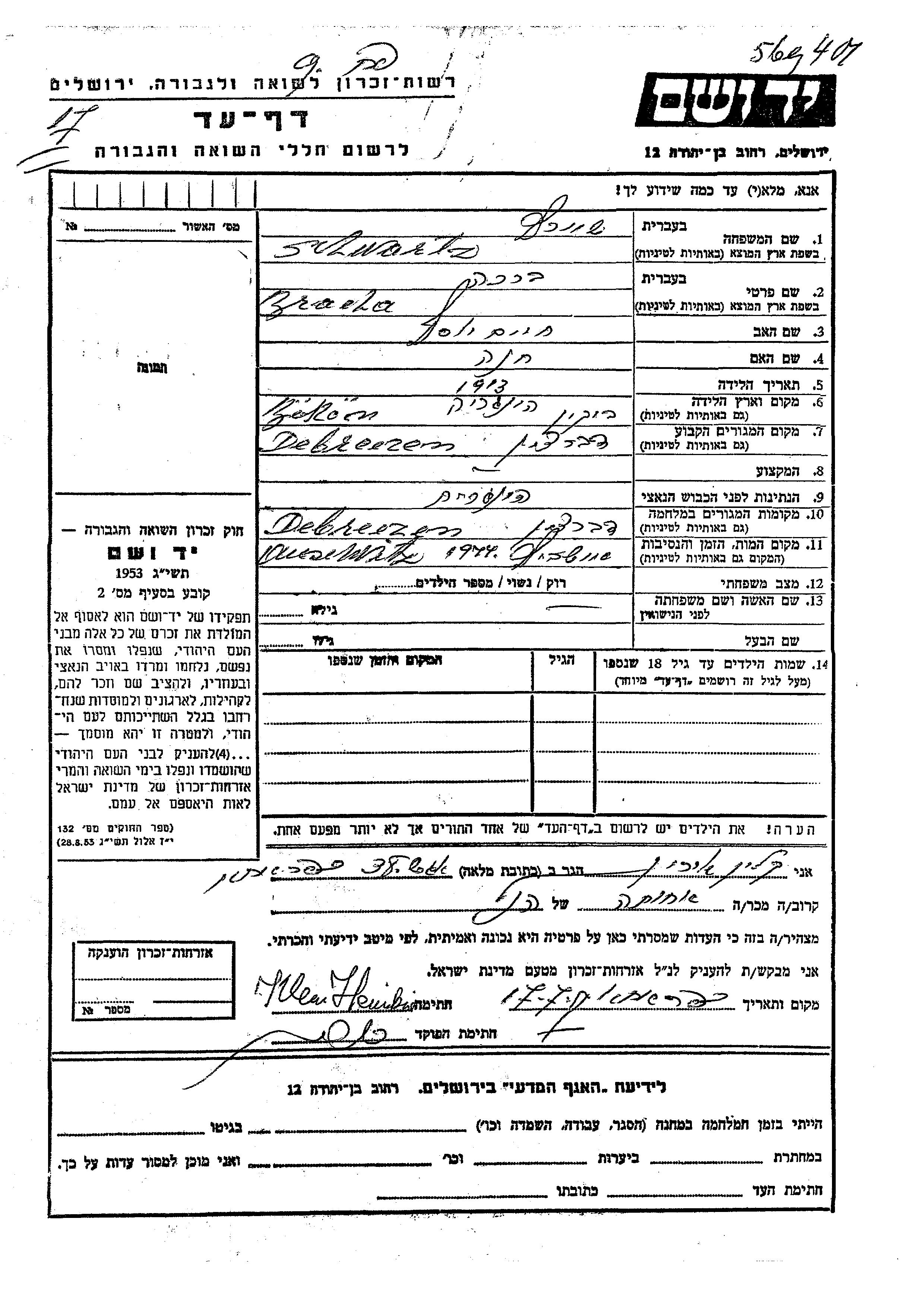 Шварц Браха 1913 Дебрецен, Венгрия Лист свидетельских показаний