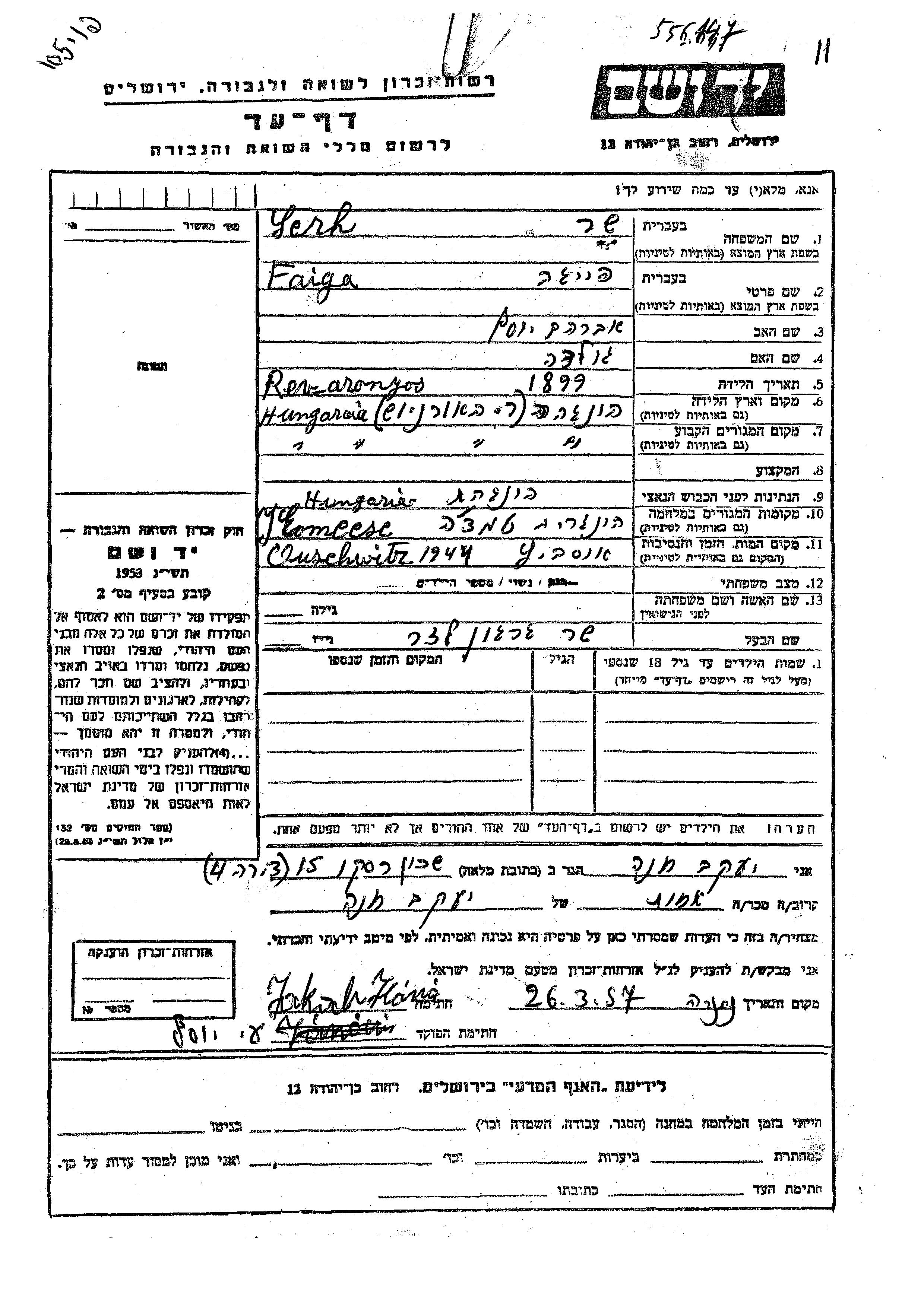 Файга Сер Шер, место рождения: Ревараньош, Венгрия. Отец: Авраам Иосеф, mать:Голда. Женат / замужем. Место жительства до войны: Ревараньош, Венгрия. Место во время войны: Тамаши, Венгрия.