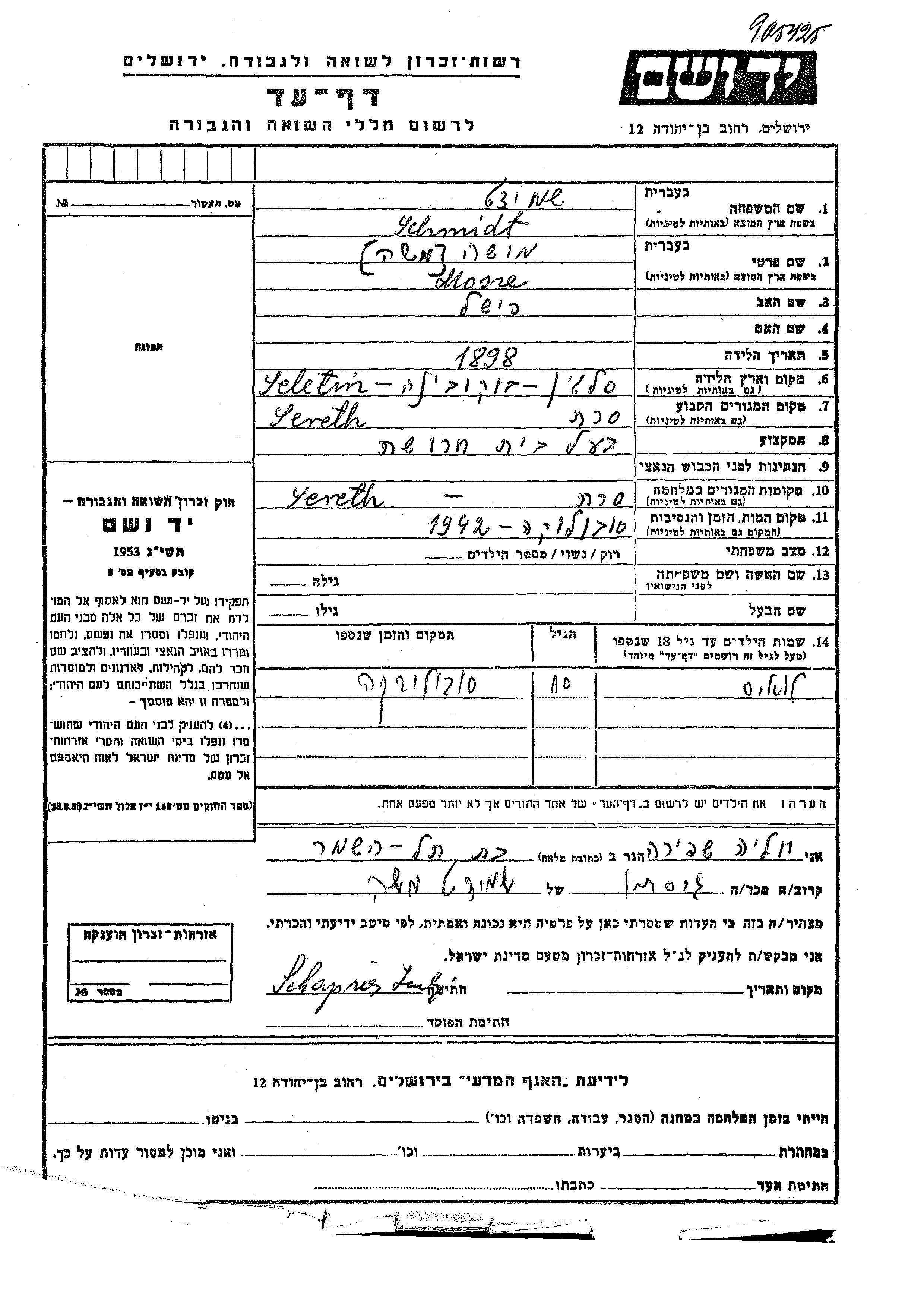 Шмидт Моше 1898 Серет, Румыния Лист свидетельских показаний