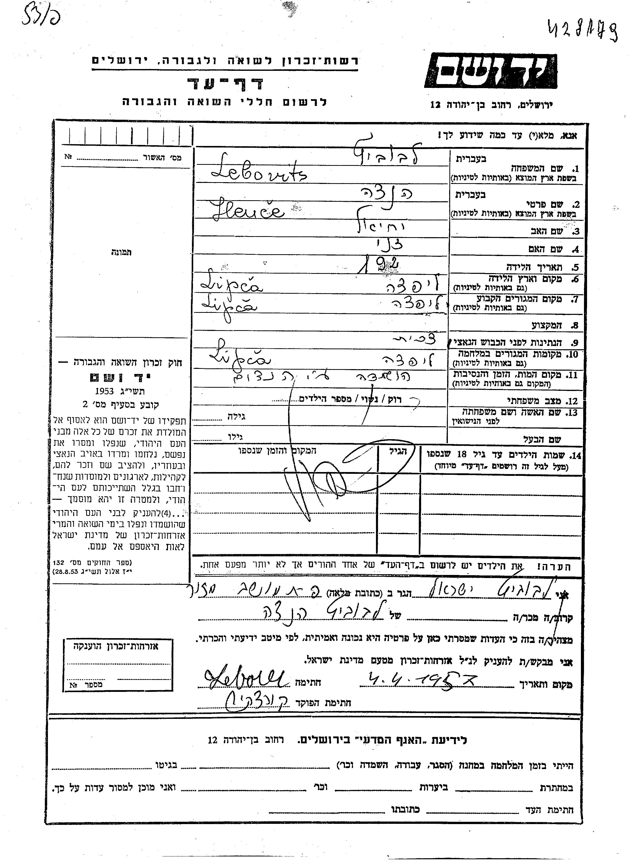 Хенце Лебовиц, место рождения: Липча, Чехословакия. Отец: Иехиэль, mать:Жени. Холост / не замужем. Место жительства до войны: Липча, Чехословакия. Место во время войны: Липча, Чехословакия.