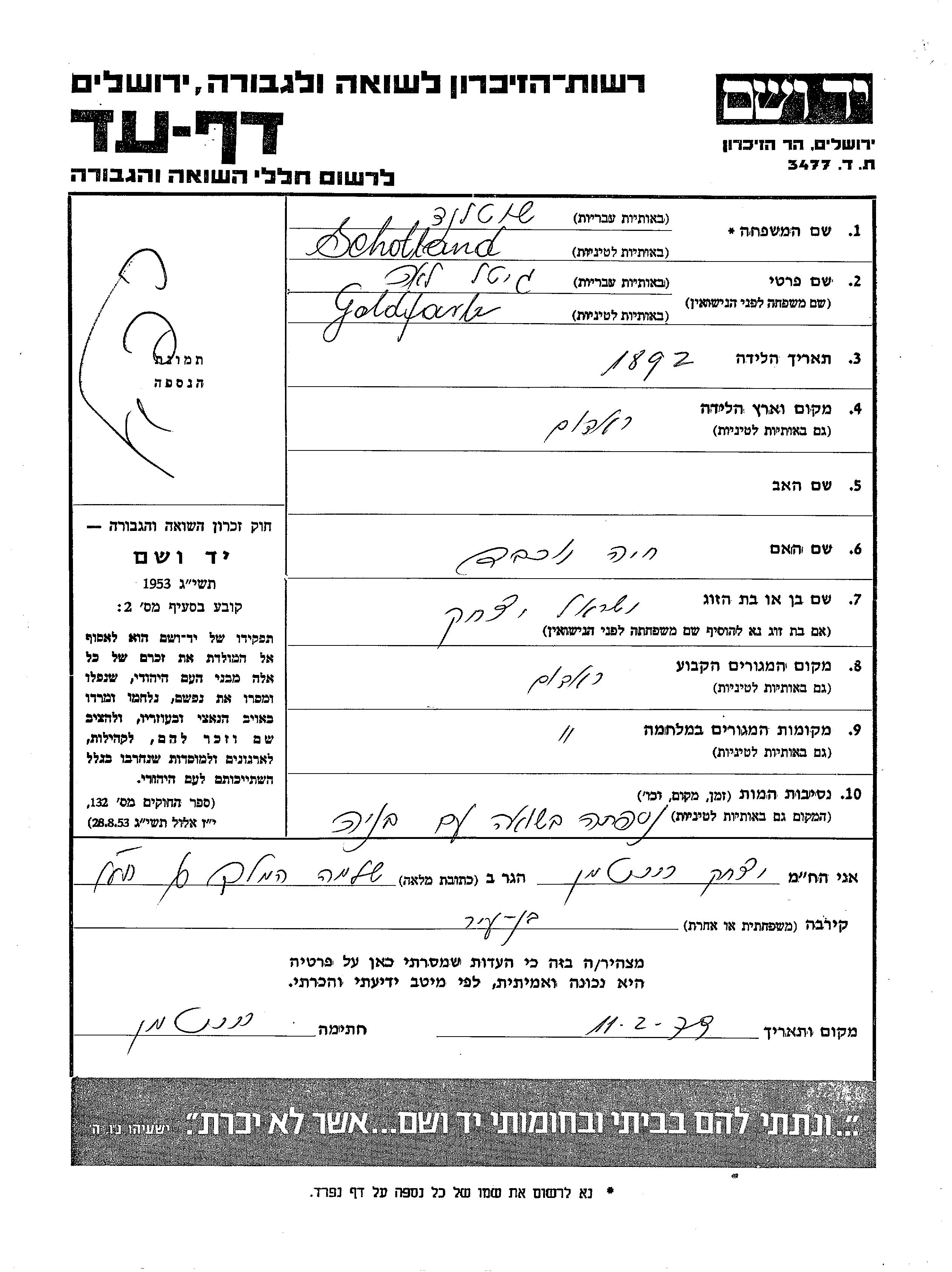 Гитель Лея Шотланд, девичья фамилия Гольдфарб, место рождения: Радом, Польша.Mать:Хая Йохевед. Женат / замужем. Место жительства до войны: Радом, Польша. Место во время войны: Радом, Польша.