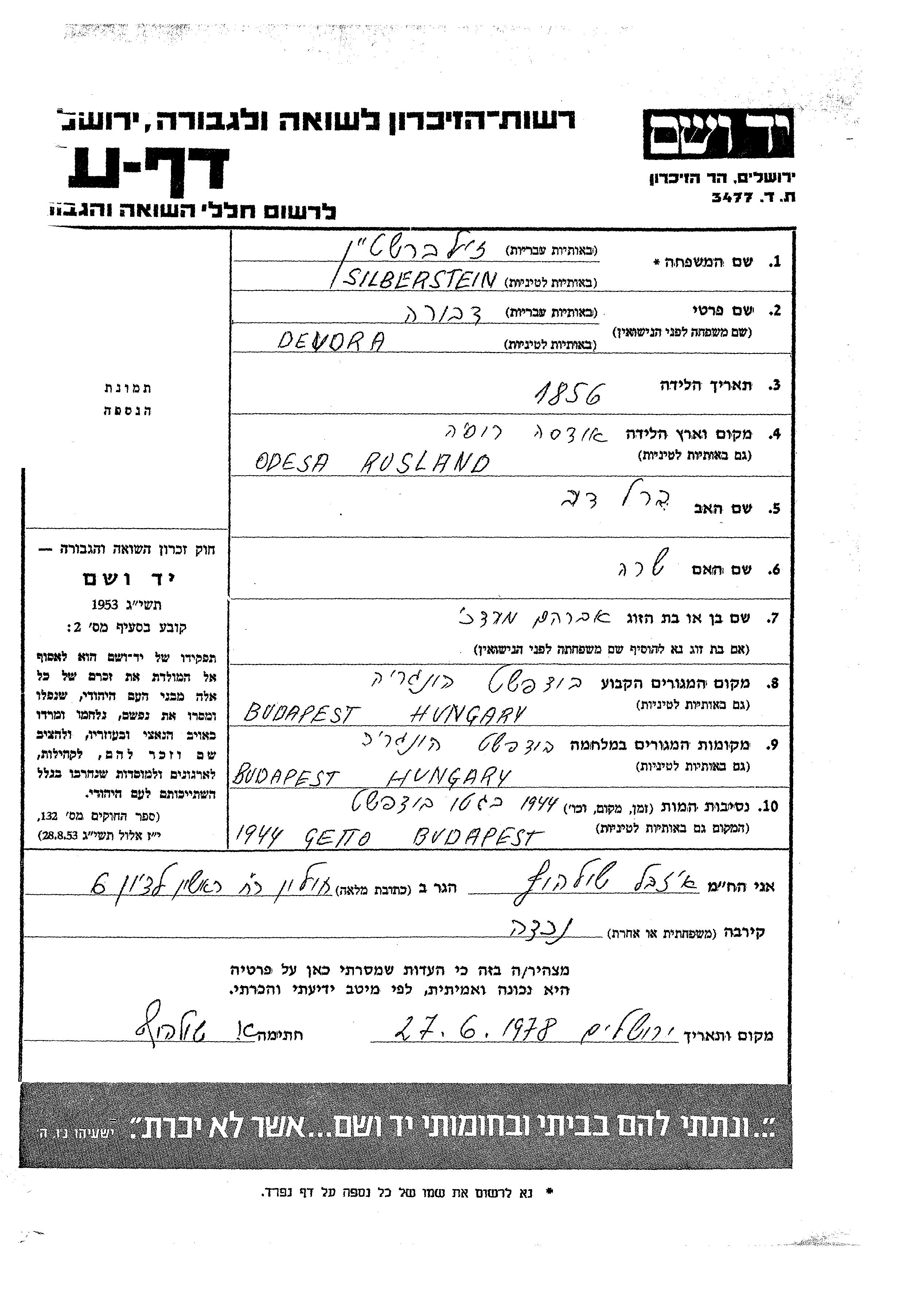 Девора Сильберштейн, место рождения: Одесса, Украина (СССР). Отец: Берл Дов, mать:Сара. Место жительства до войны: Будапешт, Венгрия. Место во время войны: Будапешт, Венгрия.