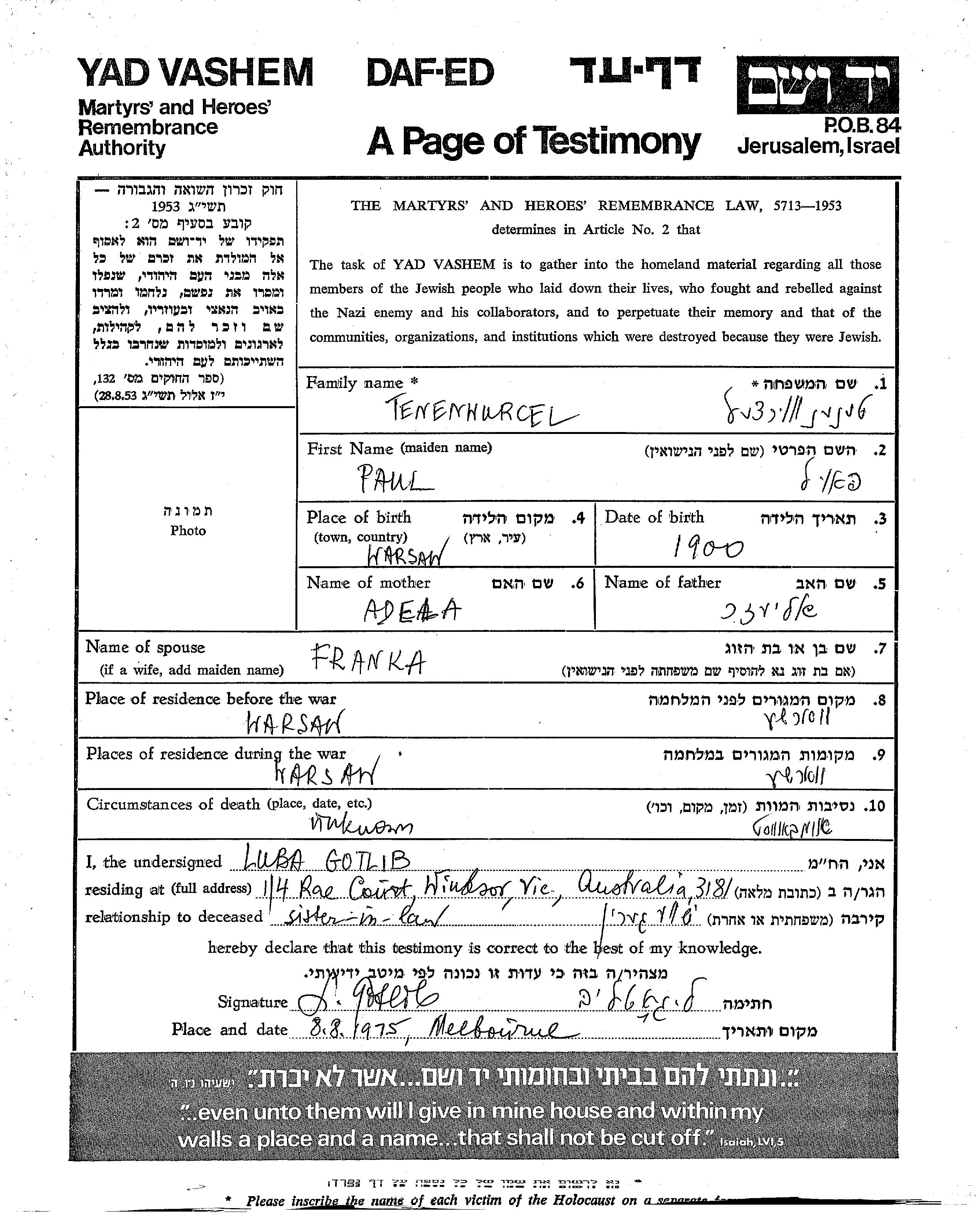Пауль Тененвурцель, место рождения: Варшава, Польша. Отец: Элиэзер, mать:Адела. Женат / замужем. Место жительства до войны: Варшава, Польша. Место во время войны: Варшава, Польша.