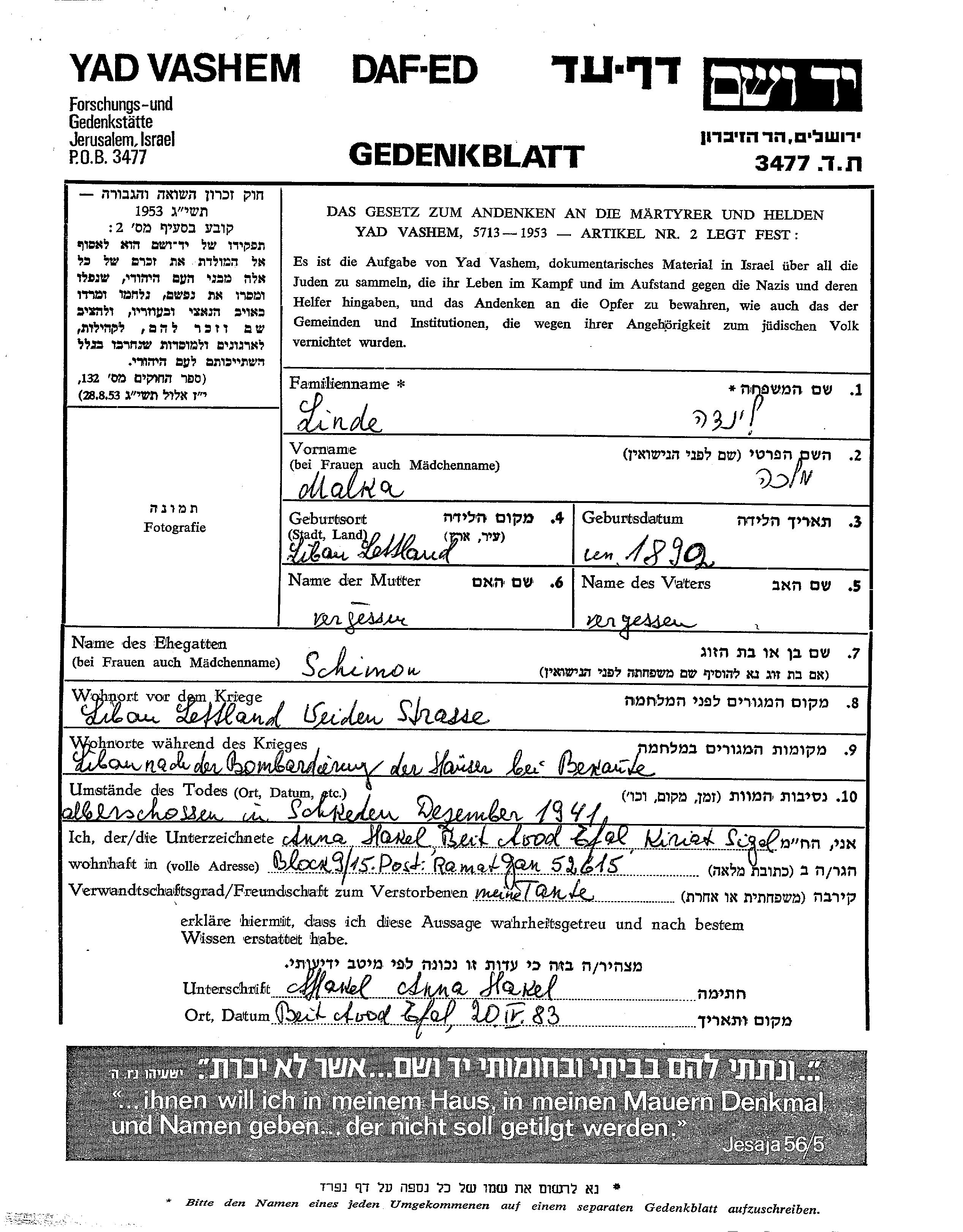 Малка Линде, место рождения: Либау, Латвия. Женат / замужем. Место жительства до войны: Либау, Латвия. Место во время войны: Либау, Латвия.