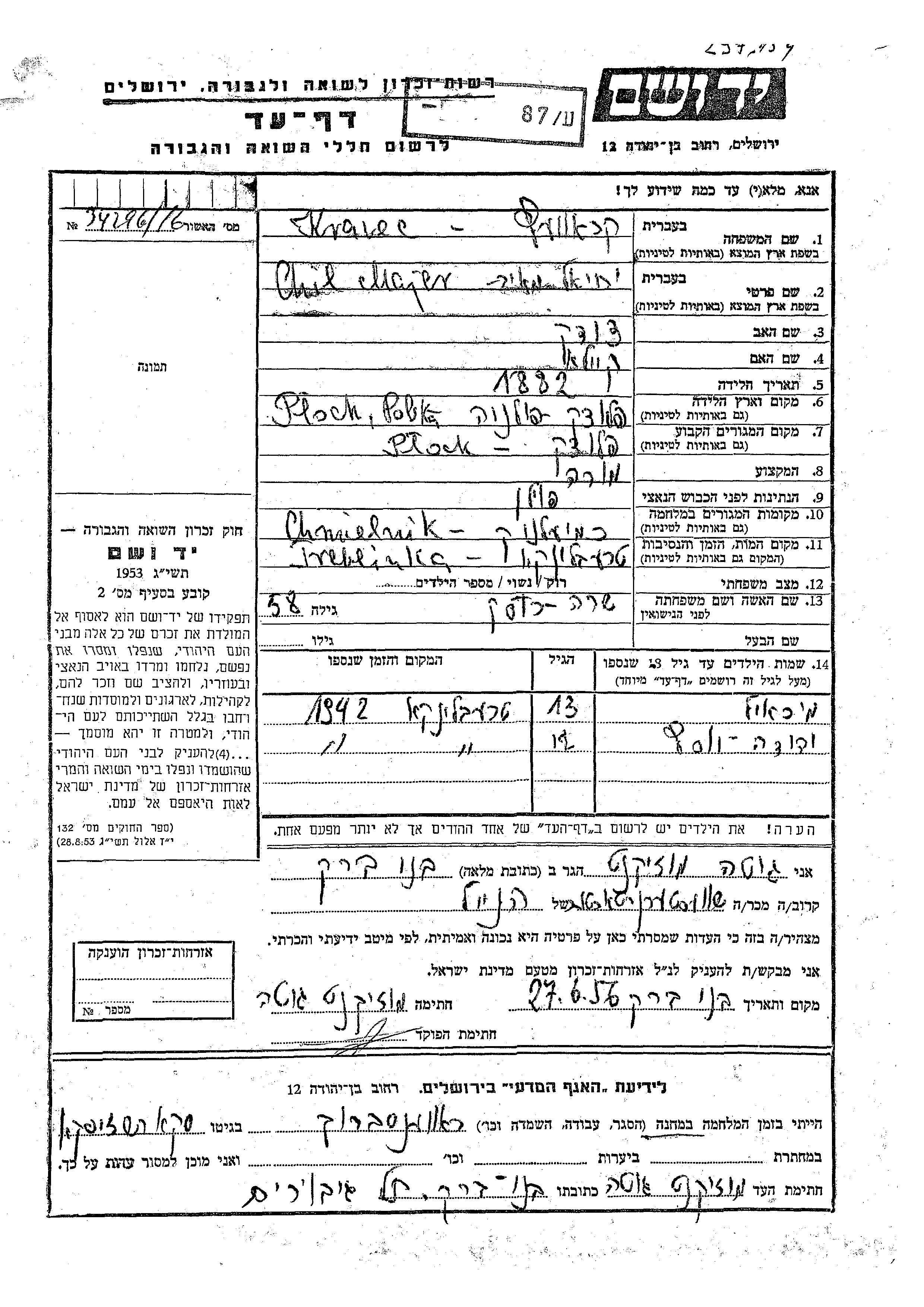 Кравец Хиль Хая Меир 1882 Плоцк, Польша Лист свидетельских показаний