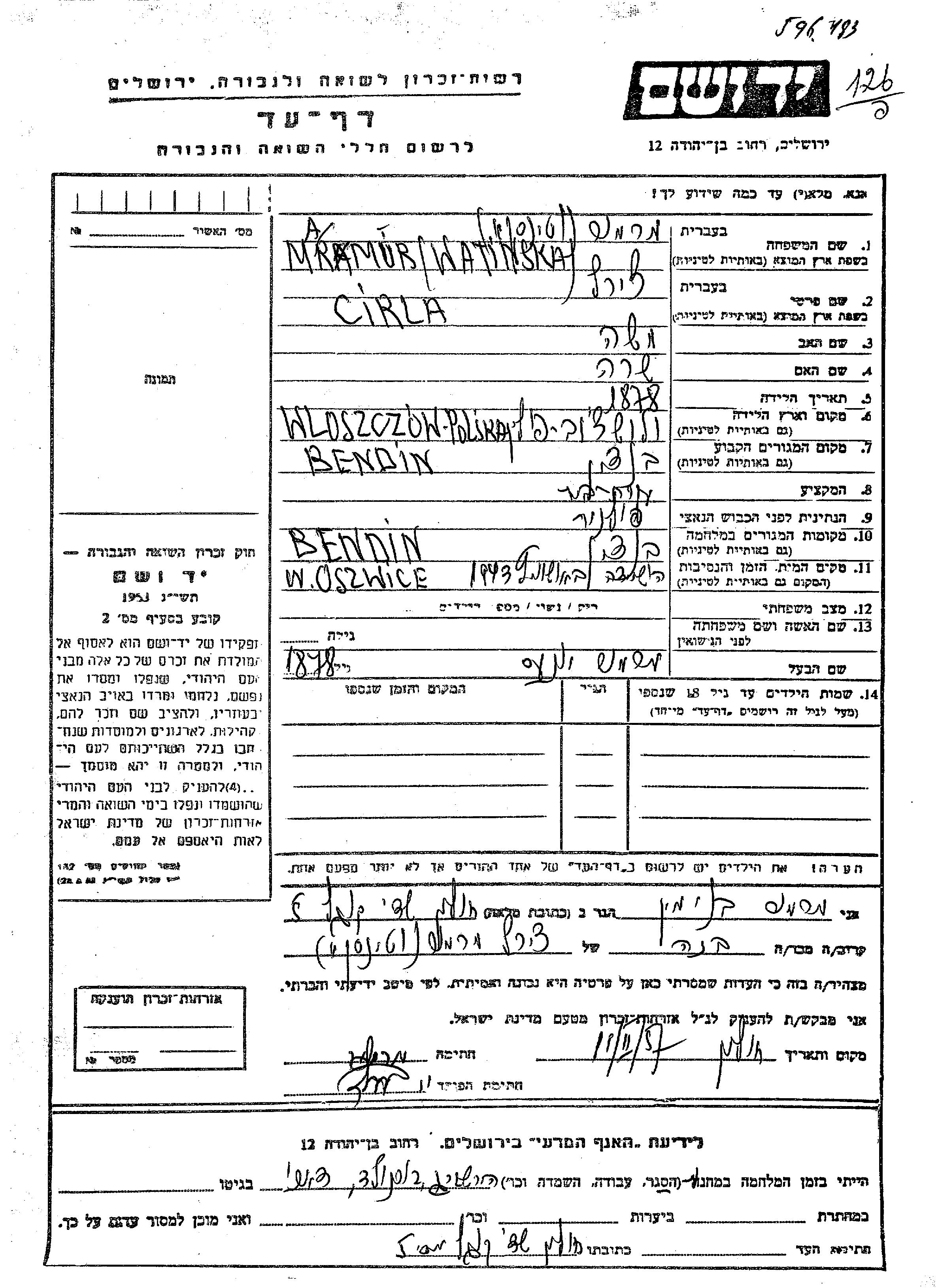 Цирла Мармур, девичья фамилия Ватинска, место рождения: Влощова, Польша. Отец: Моше, mать:Сара. Домохозяйка. Женат / замужем. Место жительства до войны: Бендин, Польша. Место во время войны: Бендин, Польша.