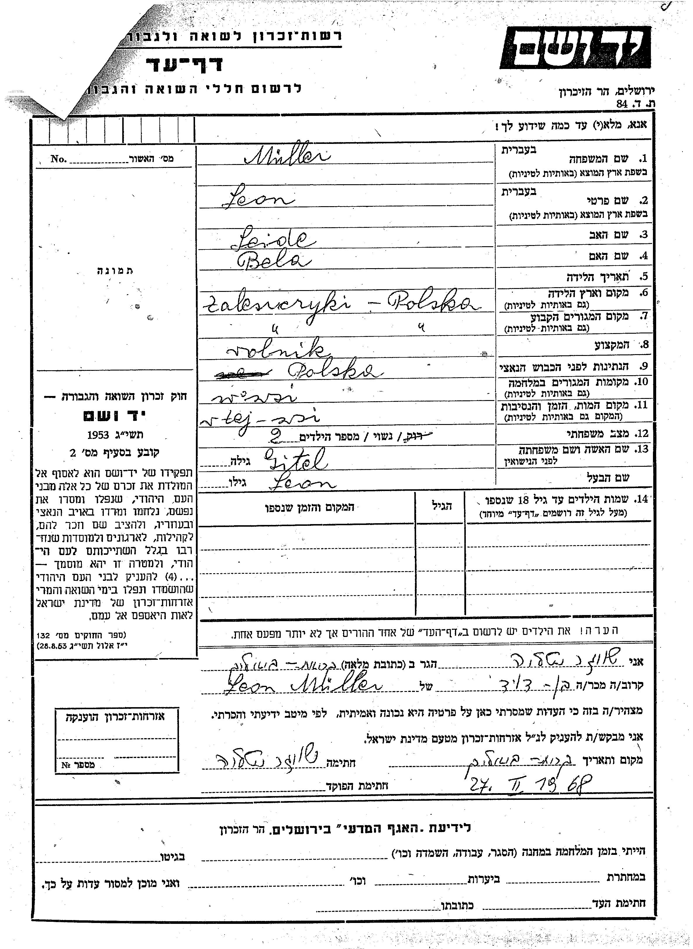 Леон Муллер, место рождения: Залещики, Польша. Отец: Зейде, mать:Бела. Земледелец / земледелица. Женат / замужем. Место жительства до войны: Залещики, Польша.