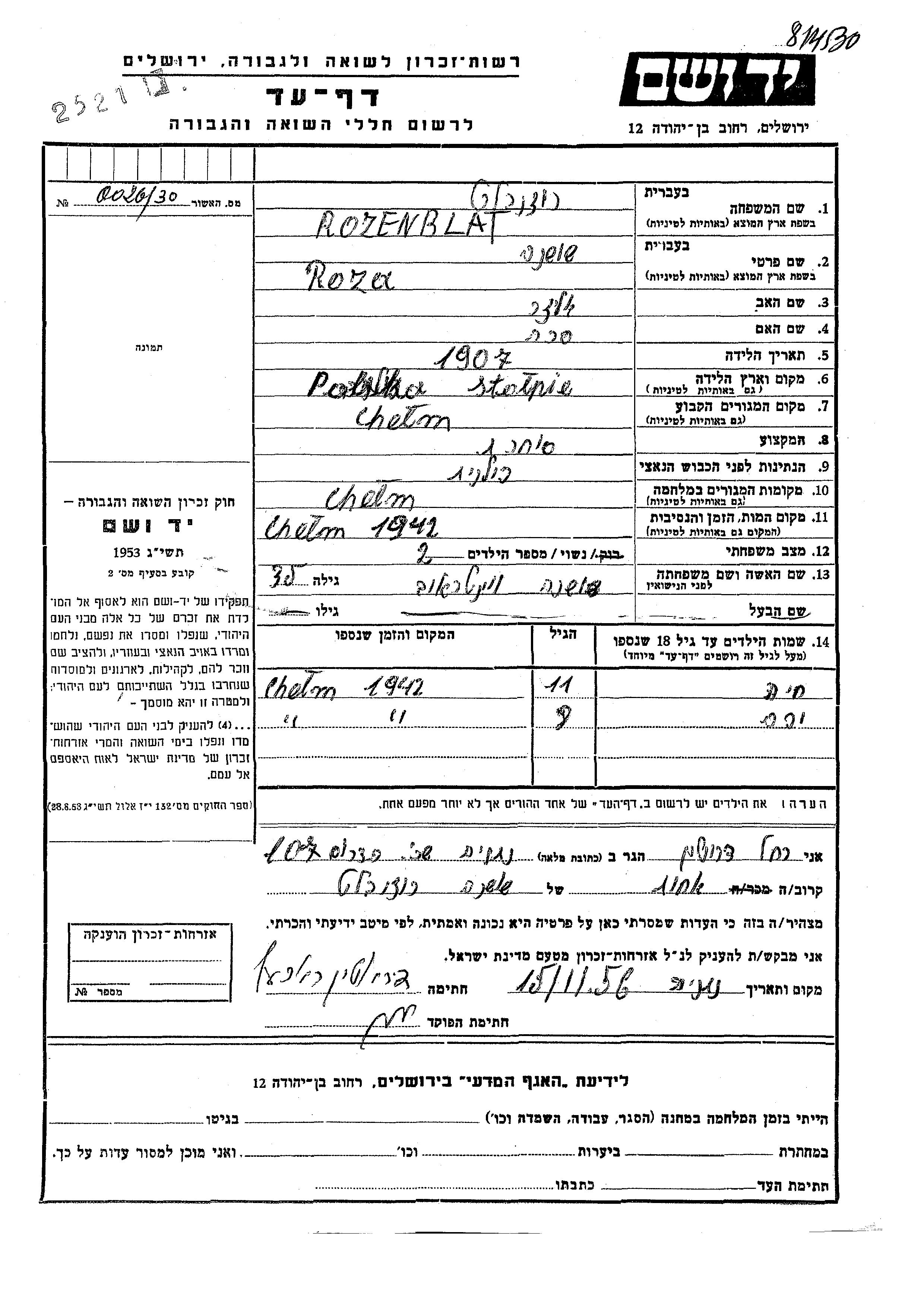 Розенблат Роза Шошана 1907 Хелм, Польша Лист свидетельских показаний