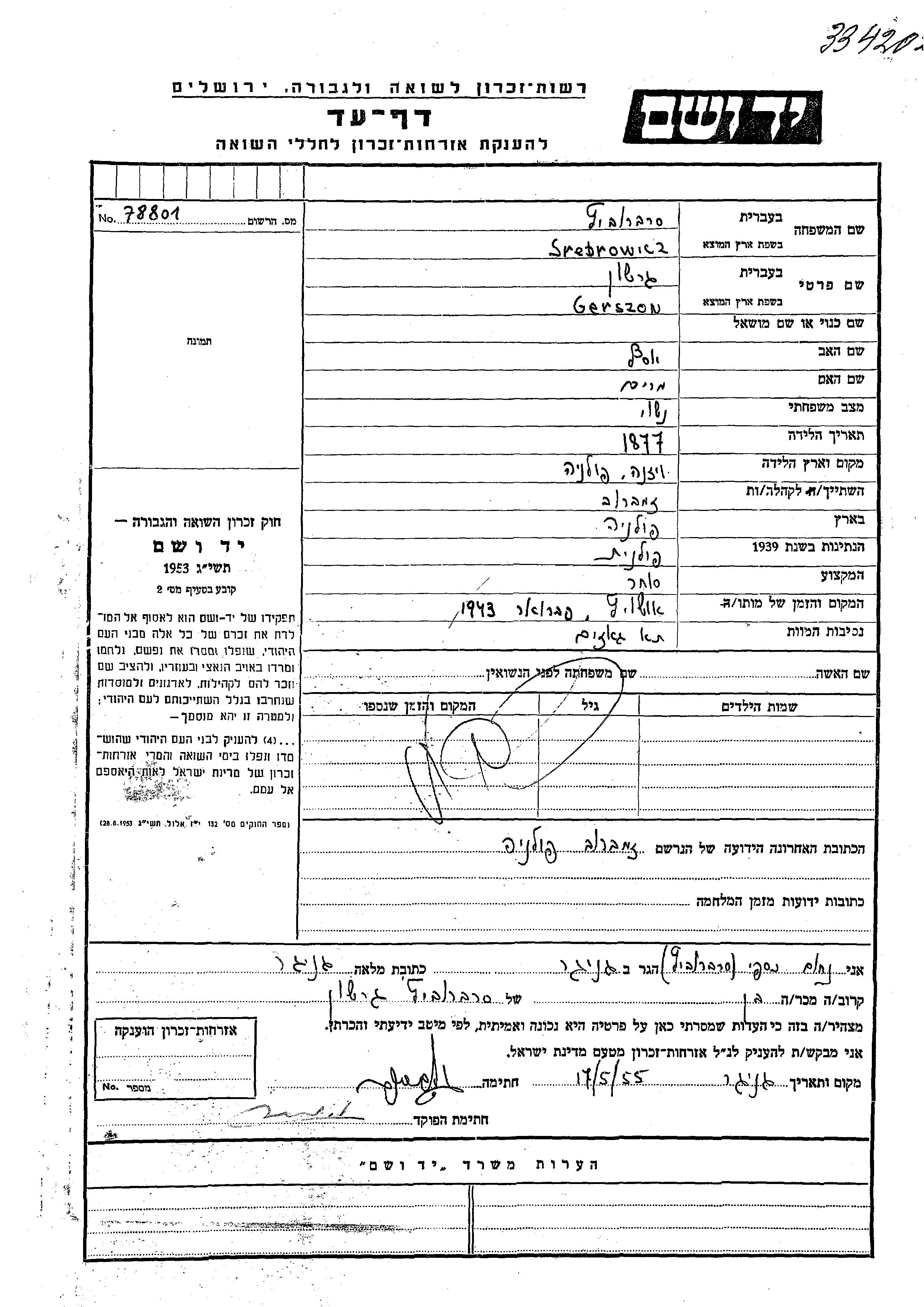 Гершон Сребрович, место рождения: Визна, Польша. Отец: Иосеф, mать:Мирьям. Торговец / торговка. Женат / замужем. Место жительства до войны: Замбрув, Польша.