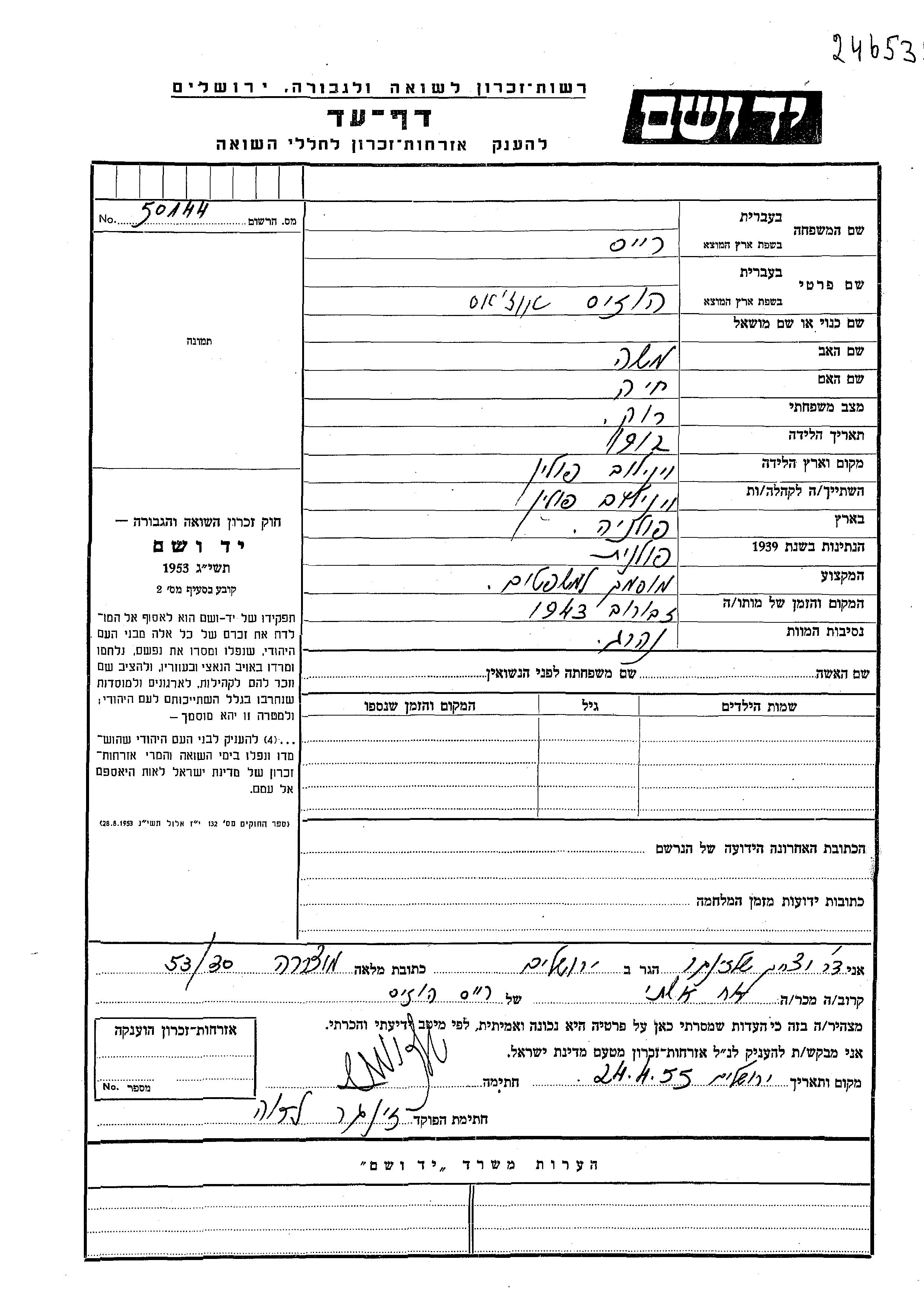 Яд Вашем - Листы свидетельских показаний Мемориального фонда
