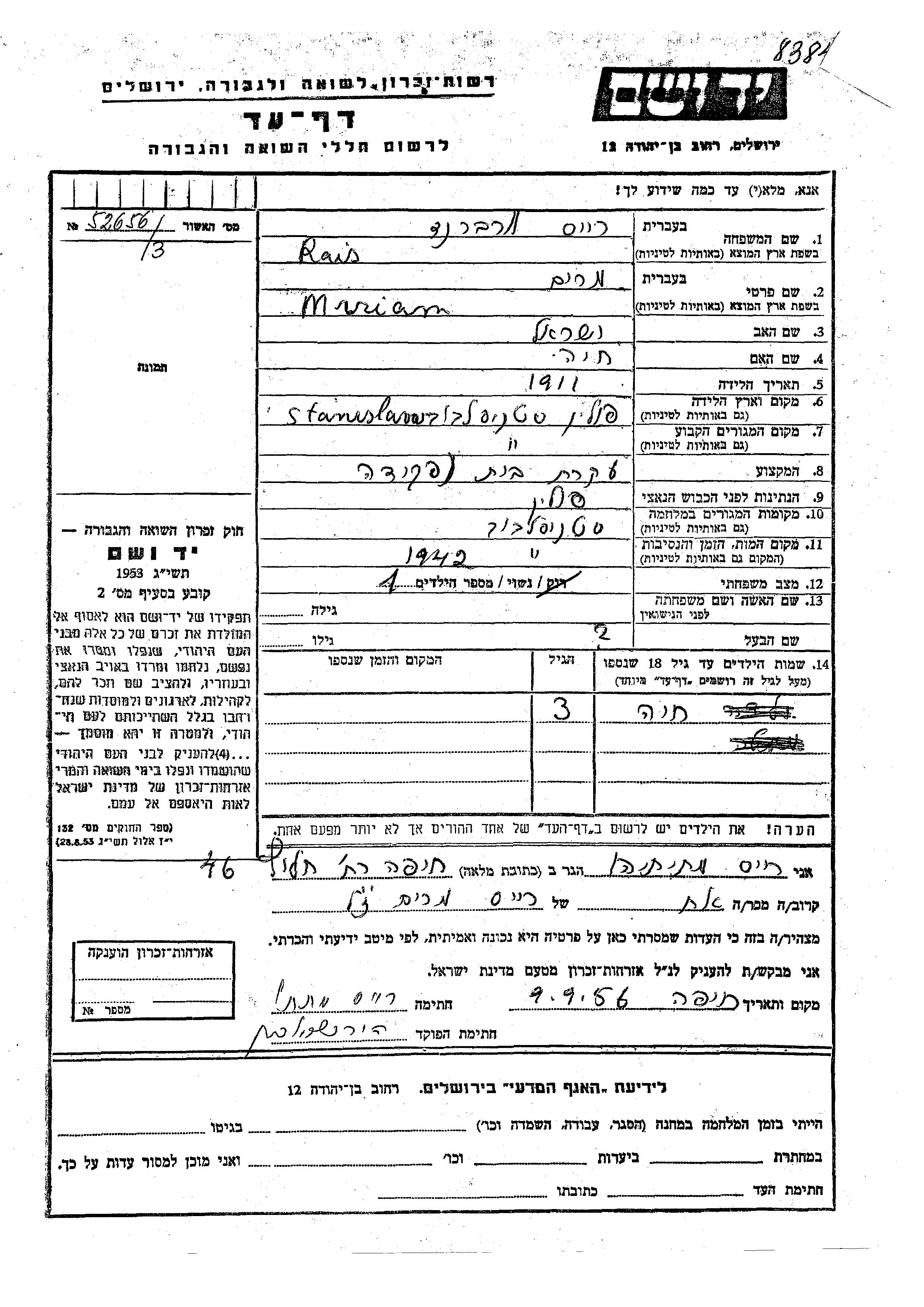 Мирьям Райс, место рождения: Станислау, Польша. Отец: Исраэль, mать:Хая. Клерк. Женат / замужем. Место жительства до войны: Станислау, Польша. Место во время войны: Станислау, Польша.