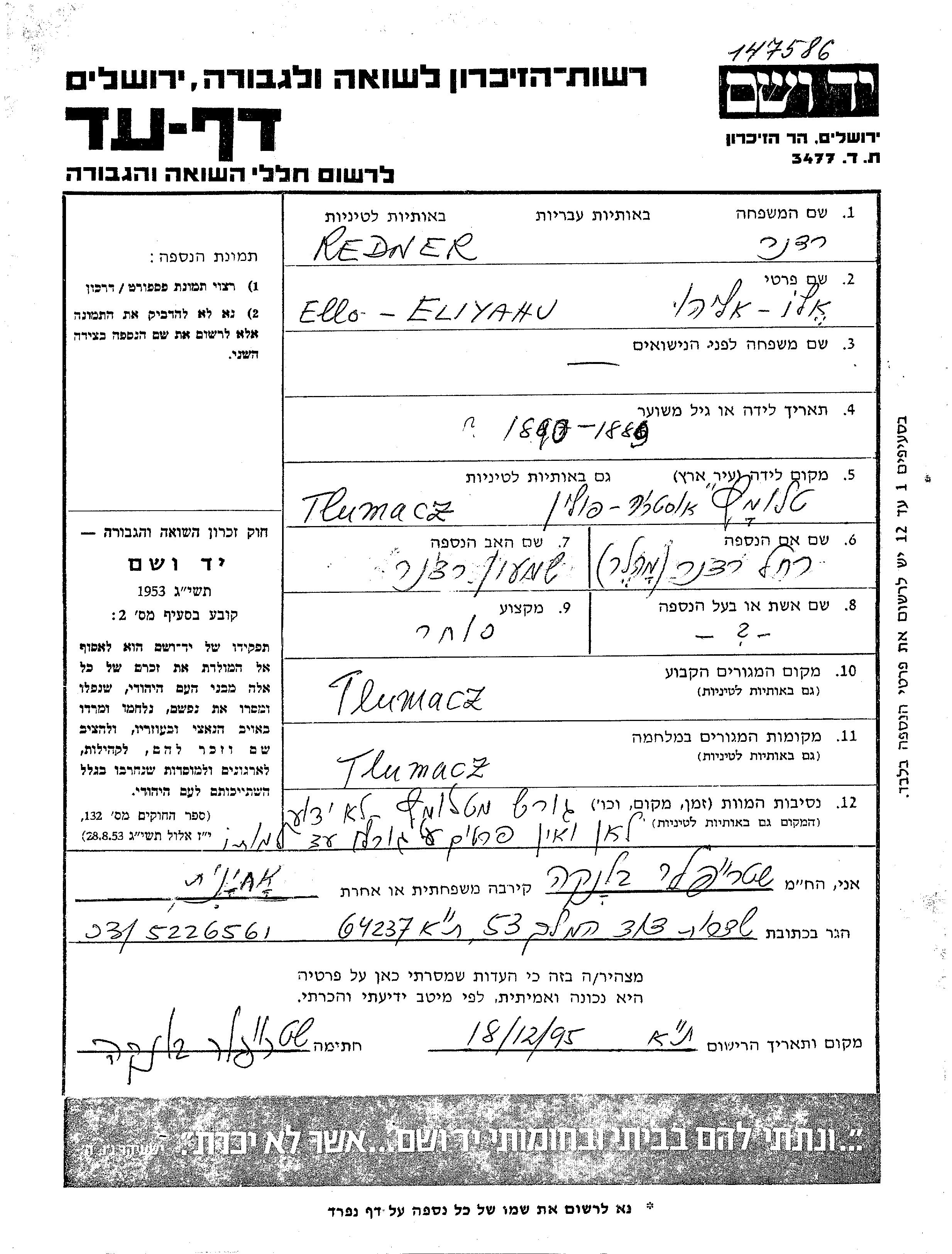 Элияху Реднер, место рождения: Тлумач, Польша. Отец: Шимон, mать:Рахель, девичья фамилия Малер. Торговец / торговка. Холост / не замужем. Место жительства до войны: Тлумач, Польша. Место во время войны: Тлумач, Польша.
