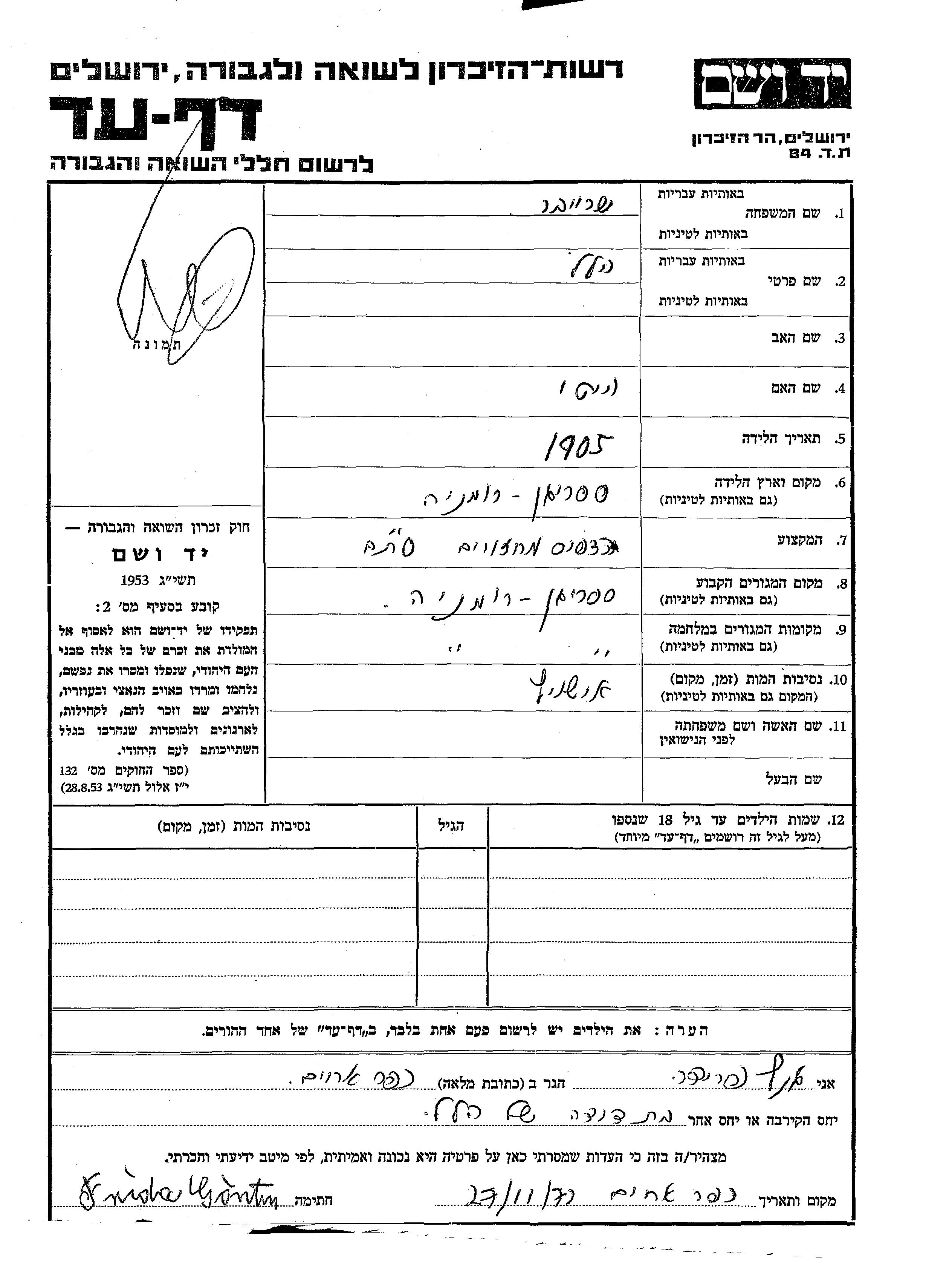 Шрайбер Хилель 1905 Регин Сат, Румыния Лист свидетельских показаний