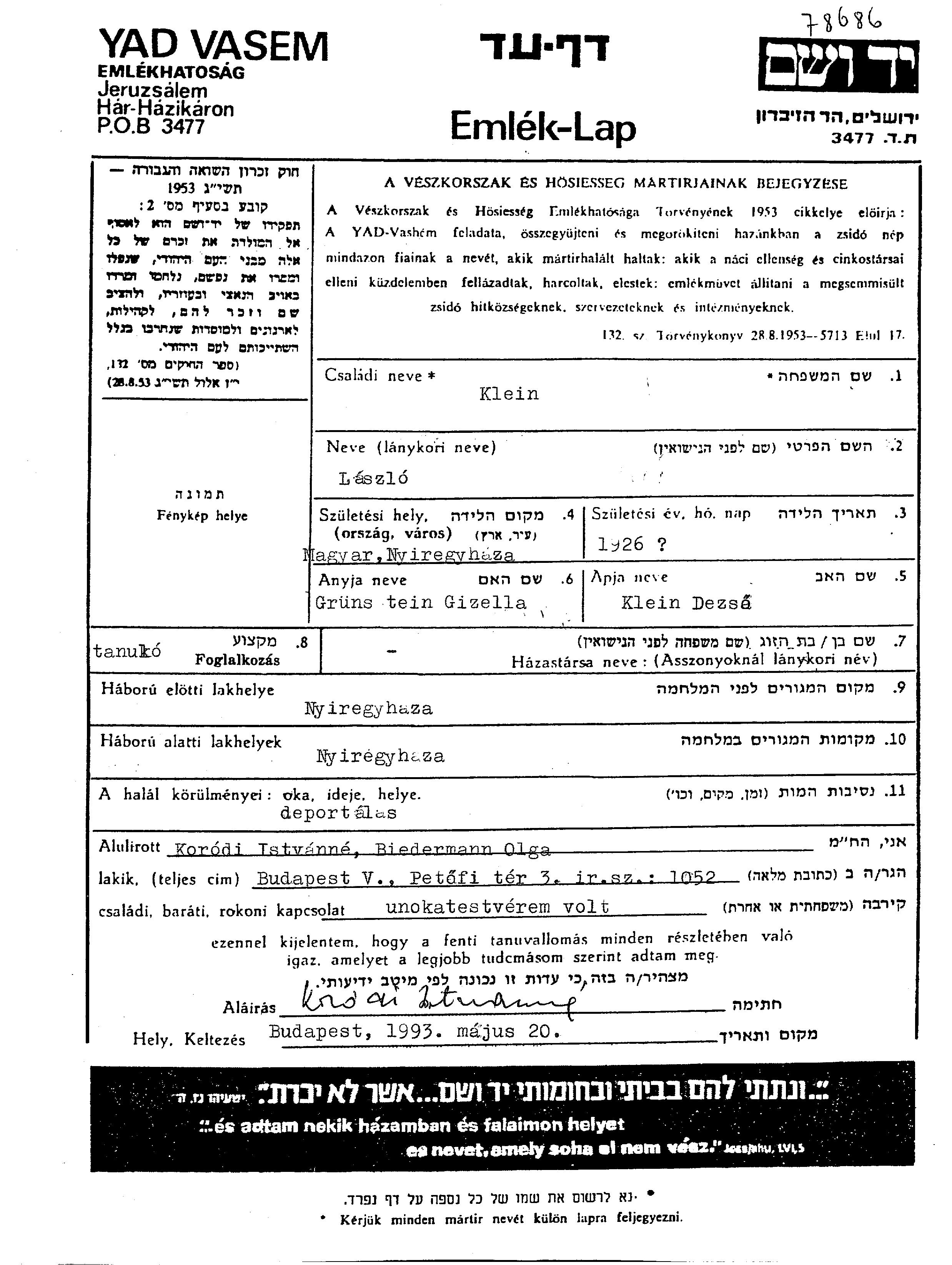 Ласло Клейн, место рождения: Ньиредьхаза, Венгрия. Отец: Дежо, mать:Гизелла, девичья фамилия Грунштайн. Ученик / ученица. Ребенок. Место жительства до войны: Ньиредьхаза, Венгрия. Место во время войны: Ньиредьхаза, Венгрия.