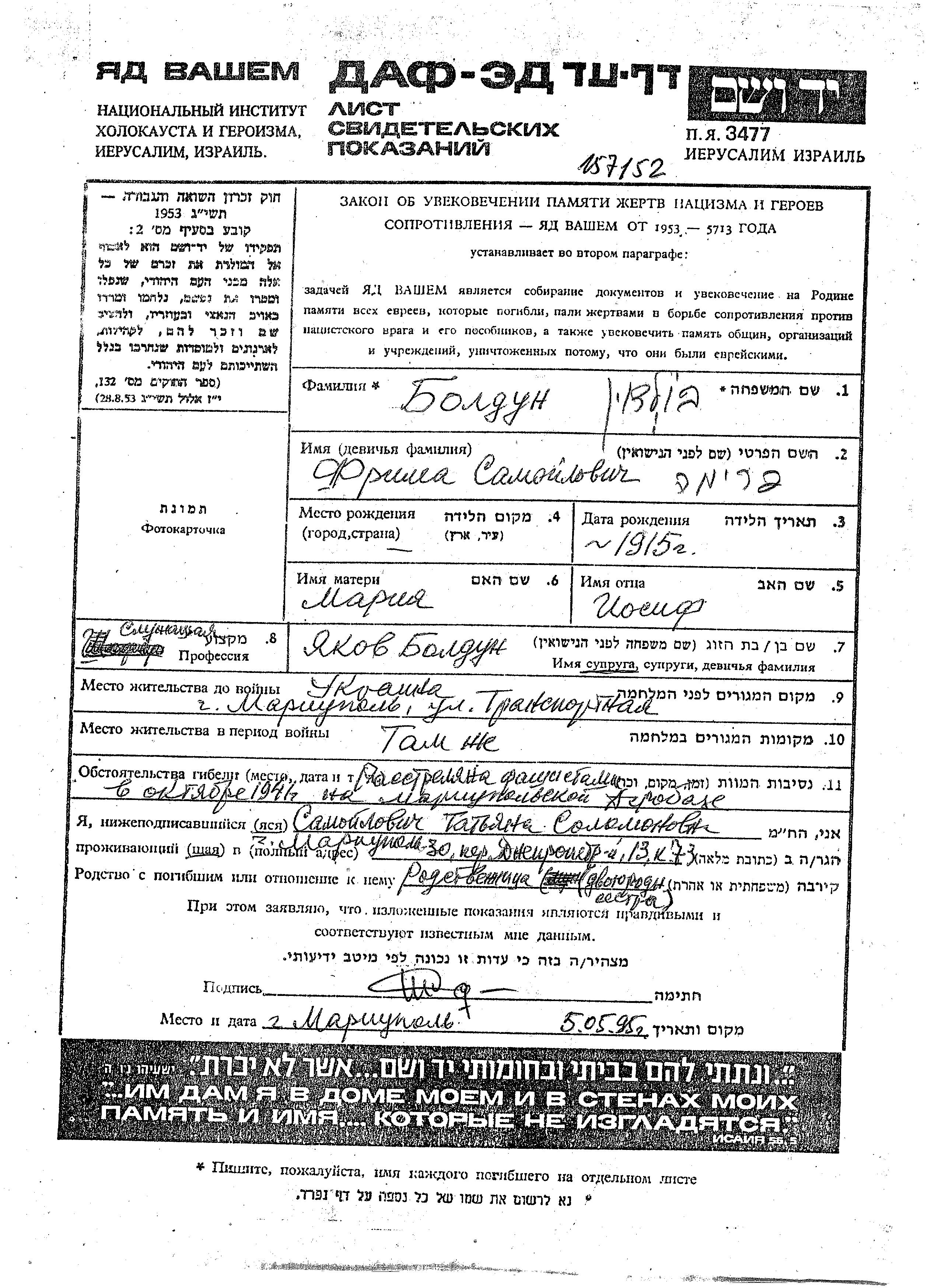 Фрима Болдун. Отец: Иосиф, mать:Мария. Клерк. Женат / замужем. Место жительства до войны: Мариуполь, Украина (СССР). Место во время войны: Мариуполь, Украина (СССР).