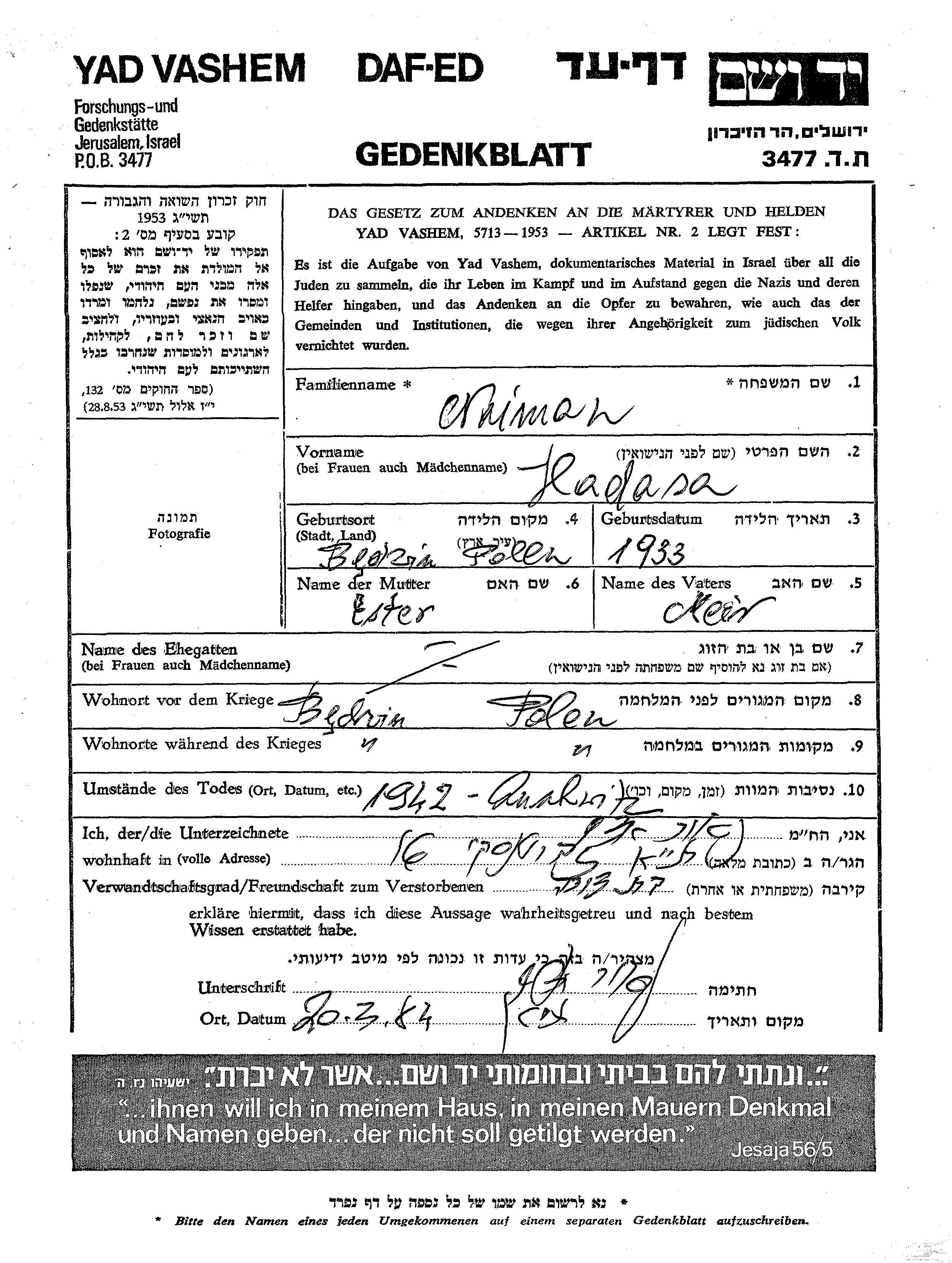 Хадаса уничтоженa в период Шоа. место смерти: Аушвиц, Польша в 1942.