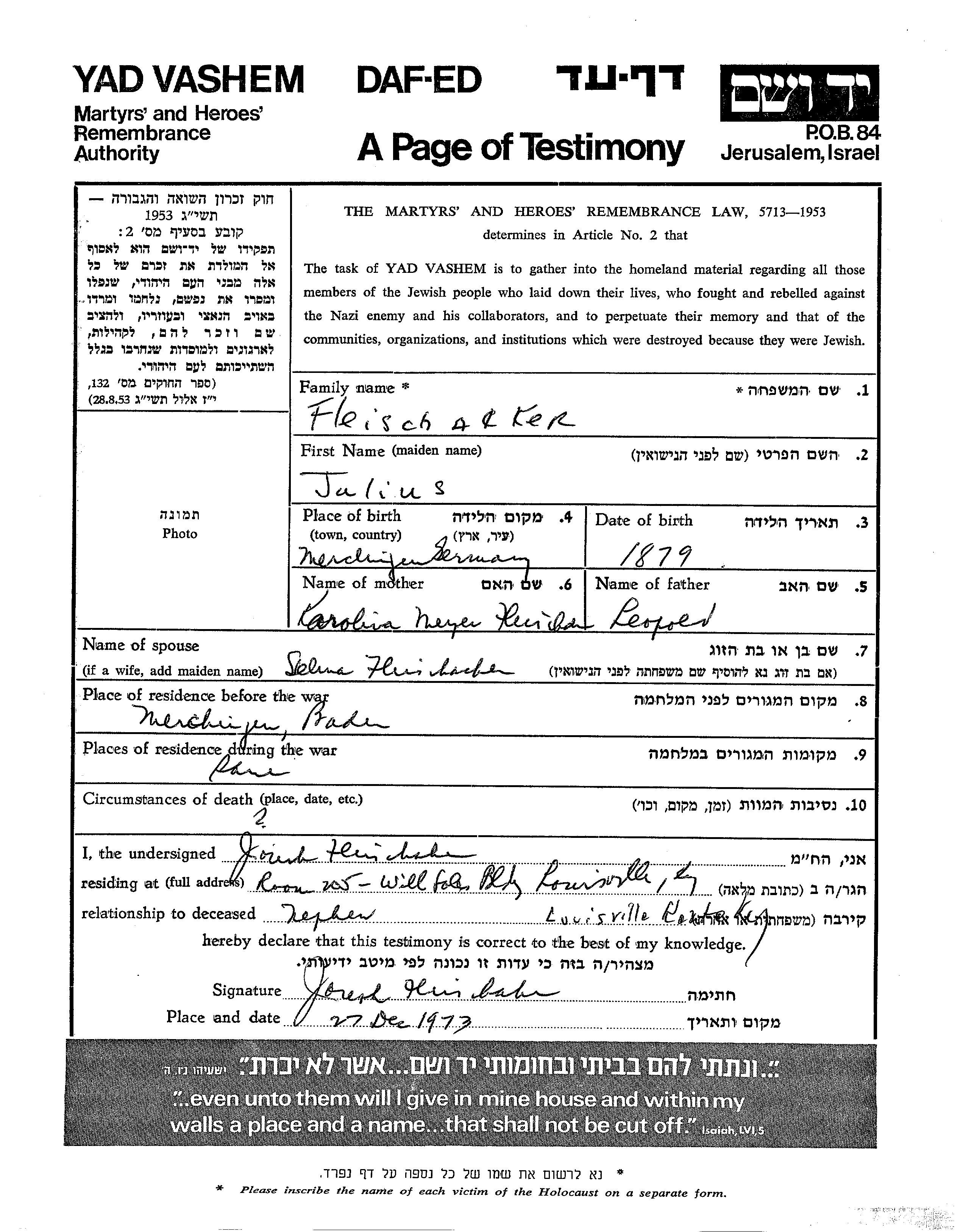 Юлиус Флайшхакер, место рождения: Мекенгейм, Германия.Mать:Каролина Хене. Место жительства до войны: Баден.