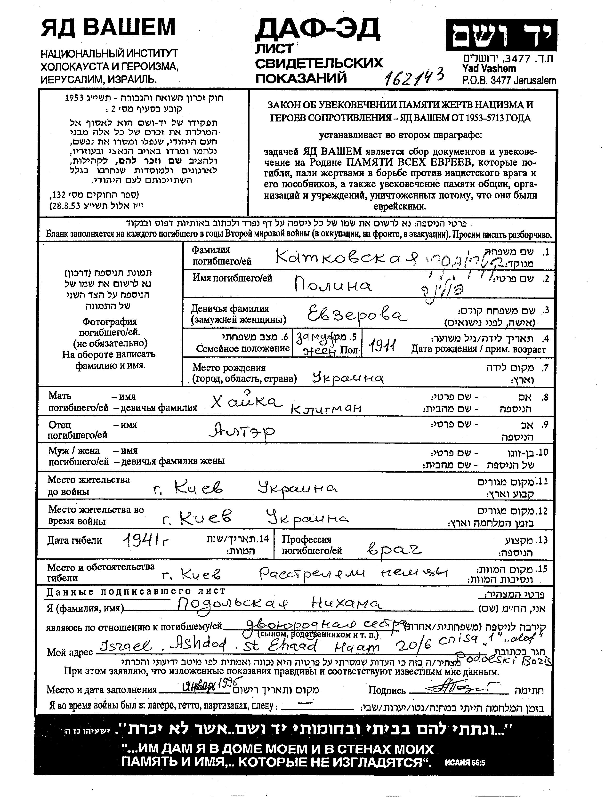 Катковски Полина 1911 Киев, Украина (СССР) Лист свидетельских показаний