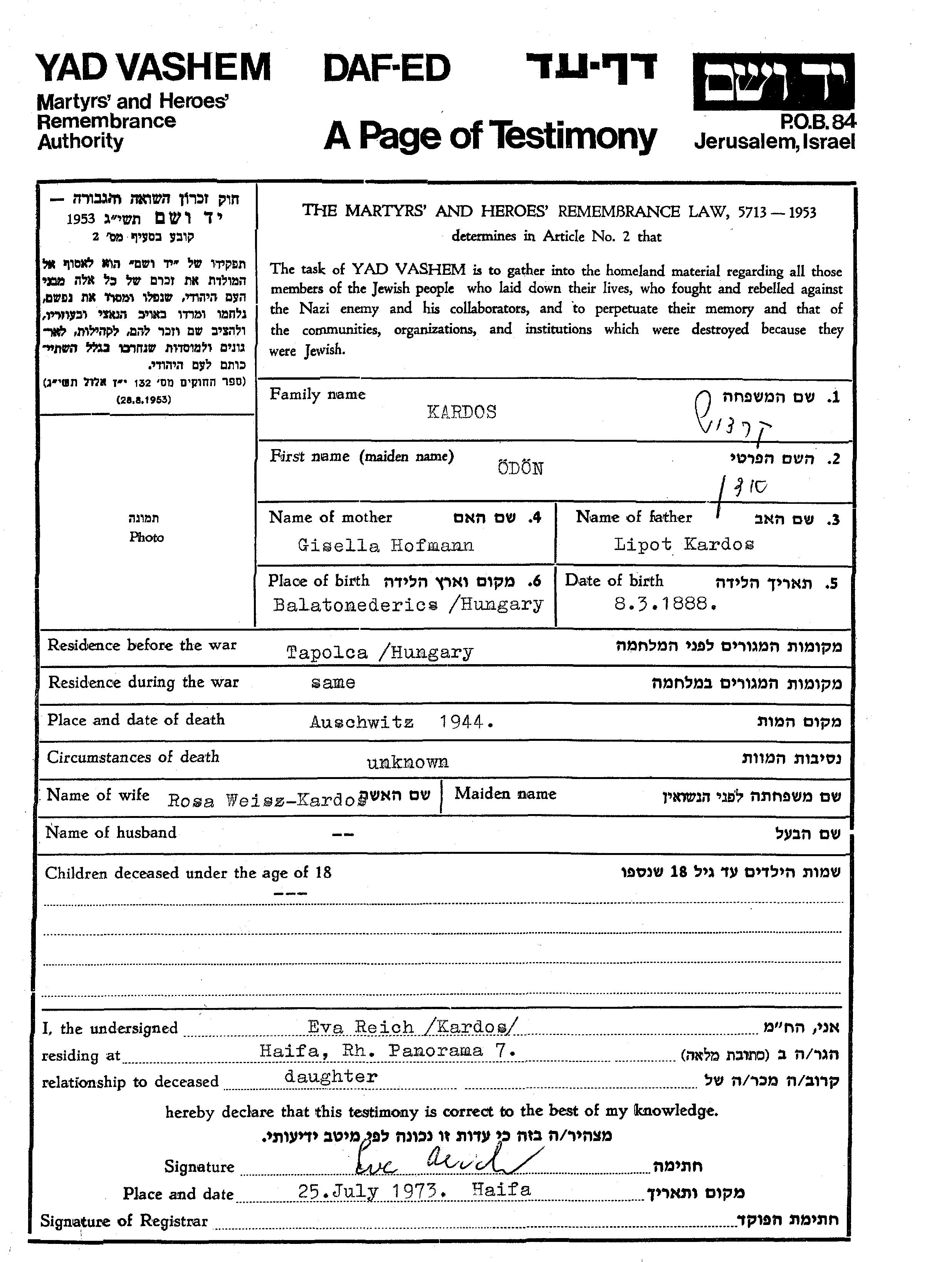 Эден Кардош Хофманн, место рождения: Балатонендред, Венгрия. Отец: Липот, mать:Гиселла. Женат / замужем. Место жительства до войны: Тапольца, Чехословакия. Место во время войны: Тапольца, Чехословакия.