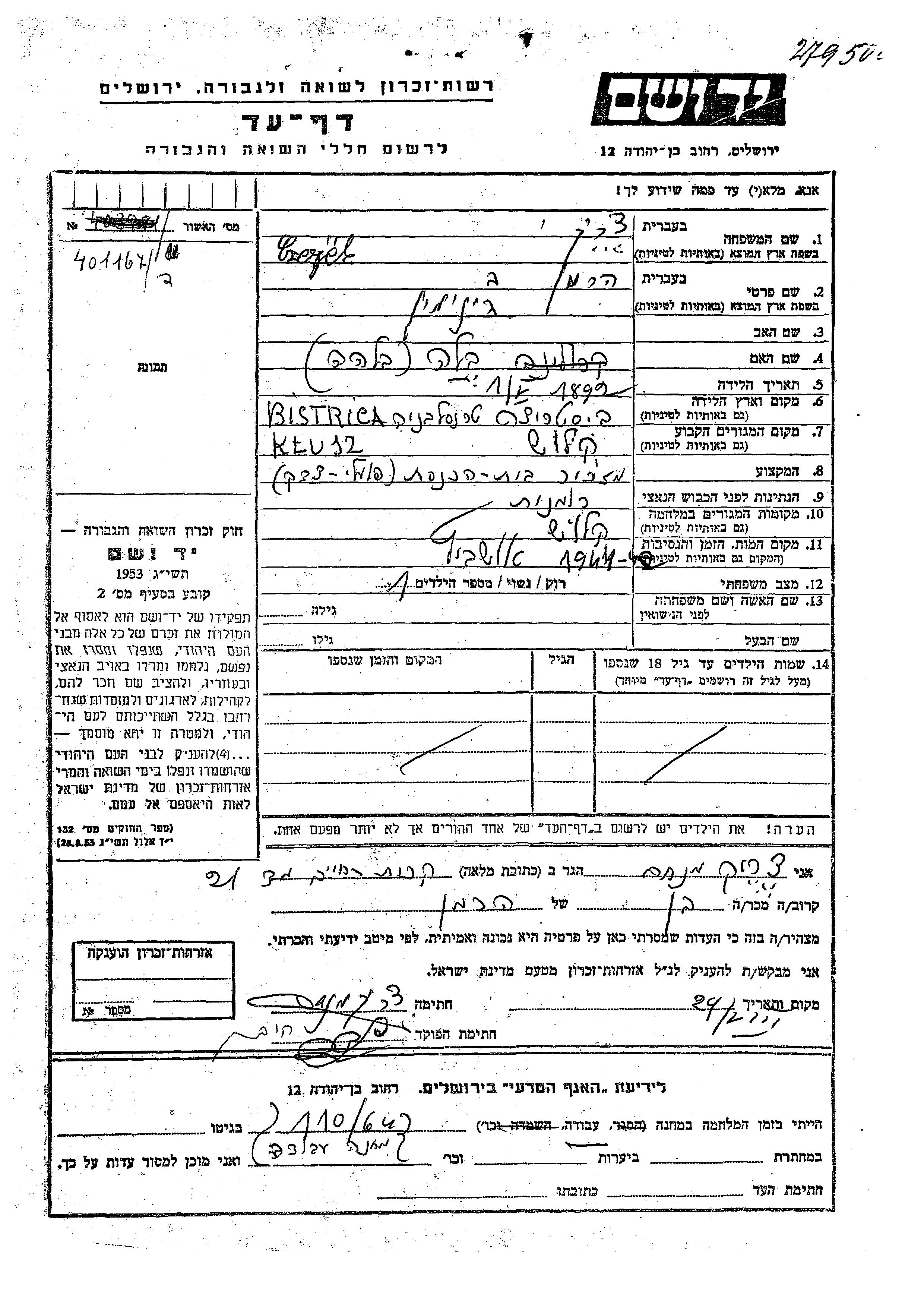 Херман Черек, место рождения: Бистрица. Отец: Биньямин, mать:Бела Бильха. מזכיר בית כנסת. Женат / замужем. Место жительства до войны: Калуш, Польша. Место во время войны: Клуш.