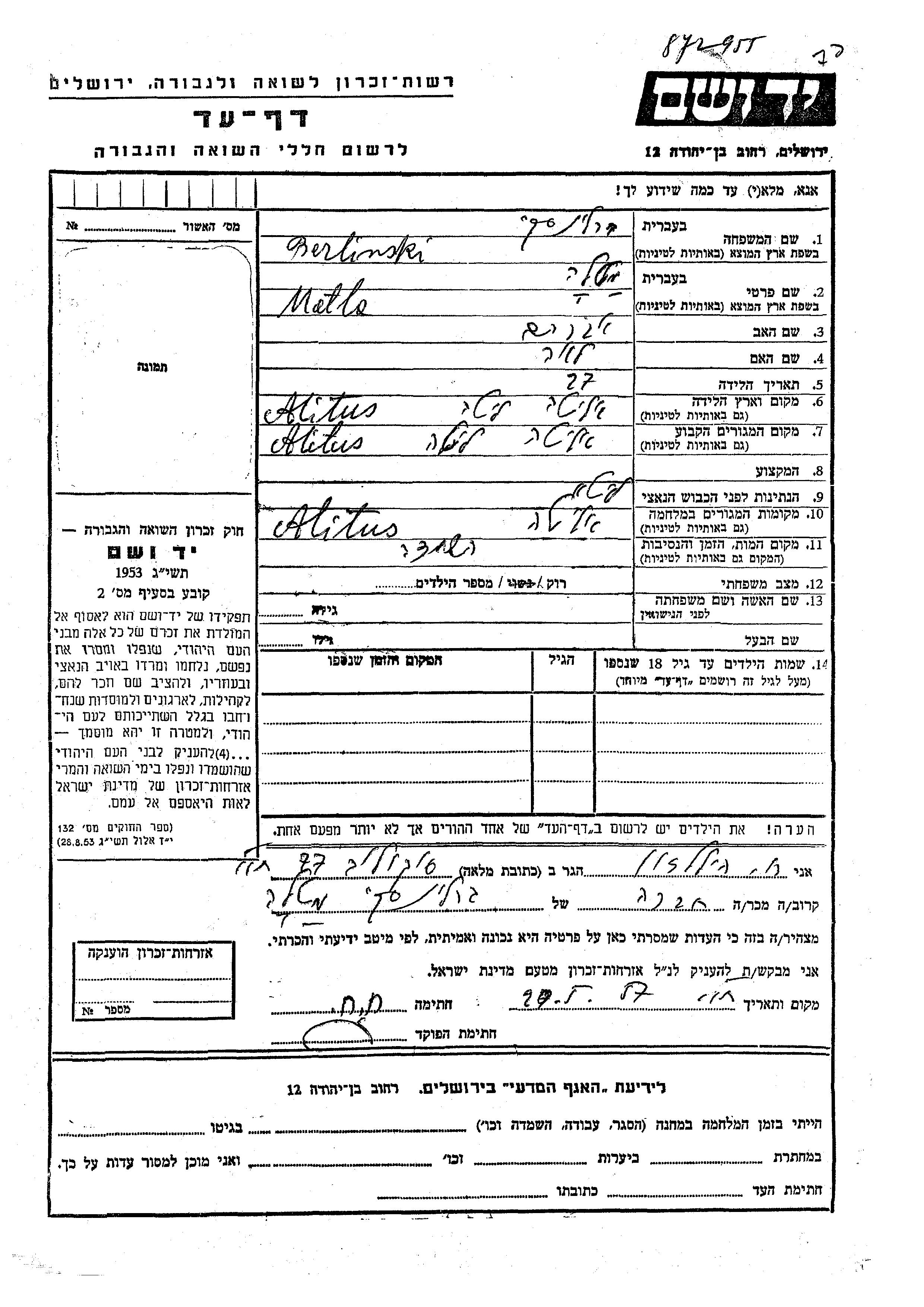 Матла Берлински, место рождения: Алитус, Литва. Отец: Авраам, mать:Лея. Холост / не замужем. Место жительства до войны: Алитус, Литва. Место во время войны: Алитус, Литва.