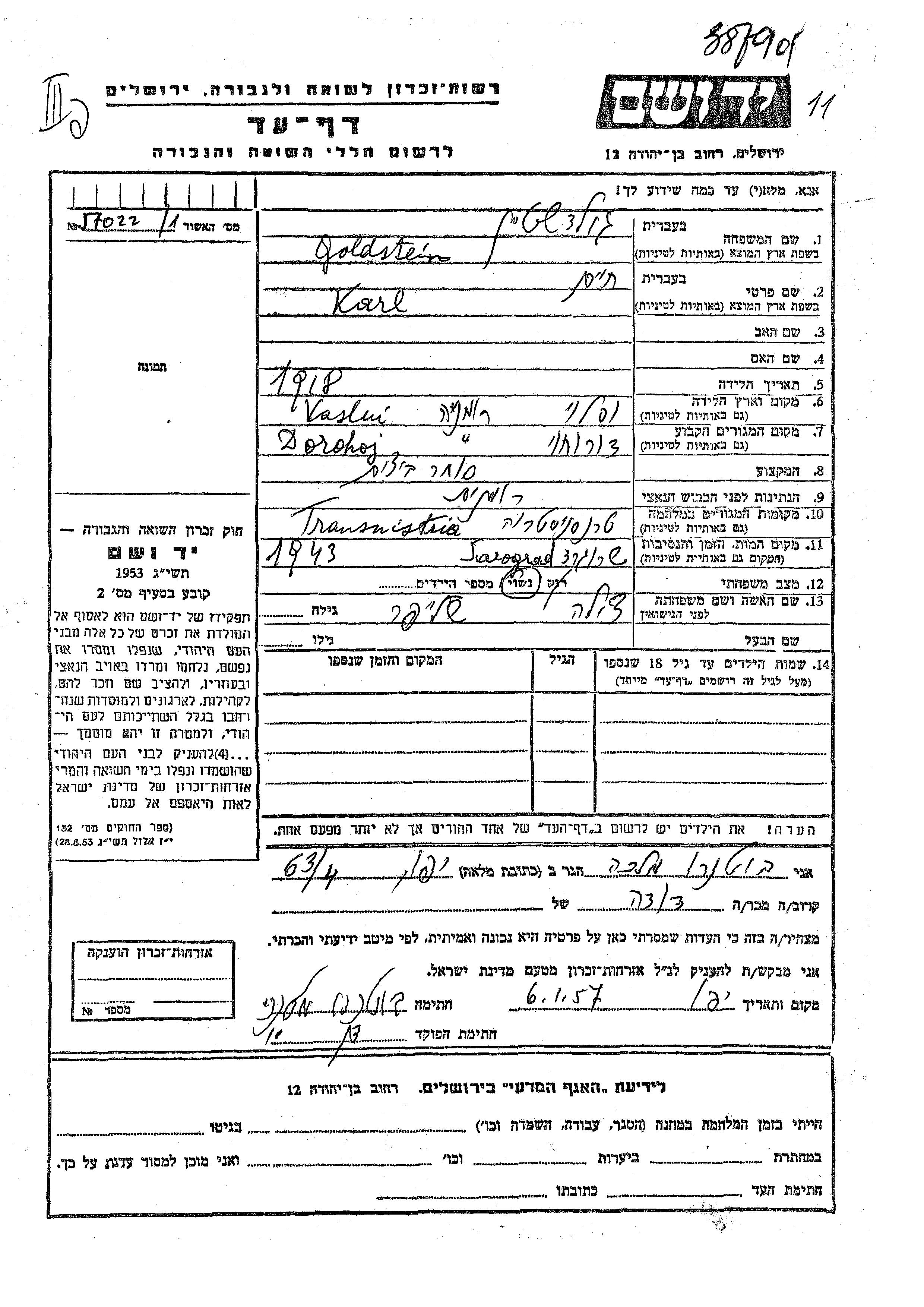 Гольдштейн Карл Хаим 1918 Дорохой, Румыния Лист свидетельских показаний