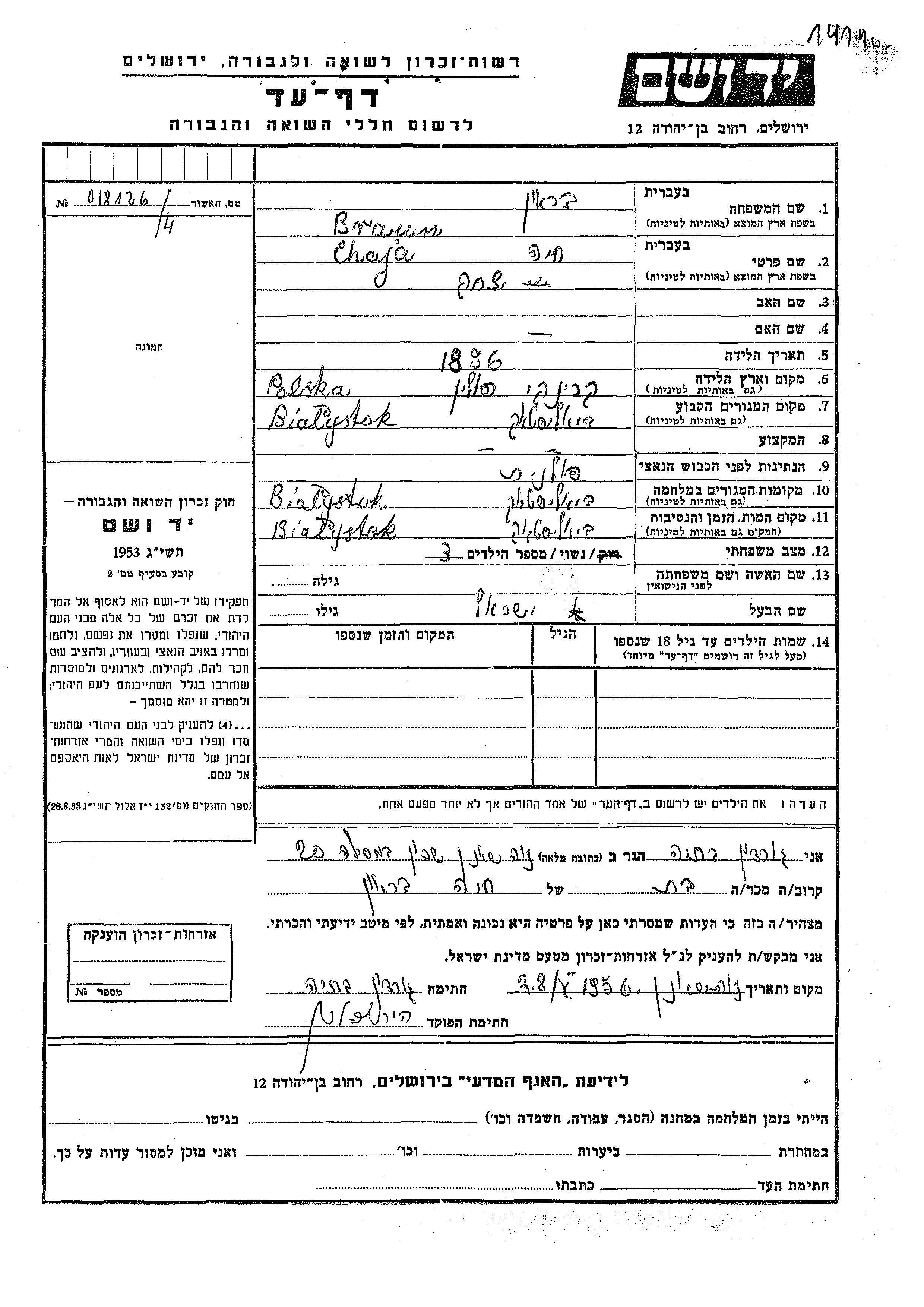 Хая Браун, место рождения: Крынки, Польша. Отец: Ицхак. Женат / замужем. Место жительства до войны: Белосток, Польша. Место во время войны: Белосток, Польша.