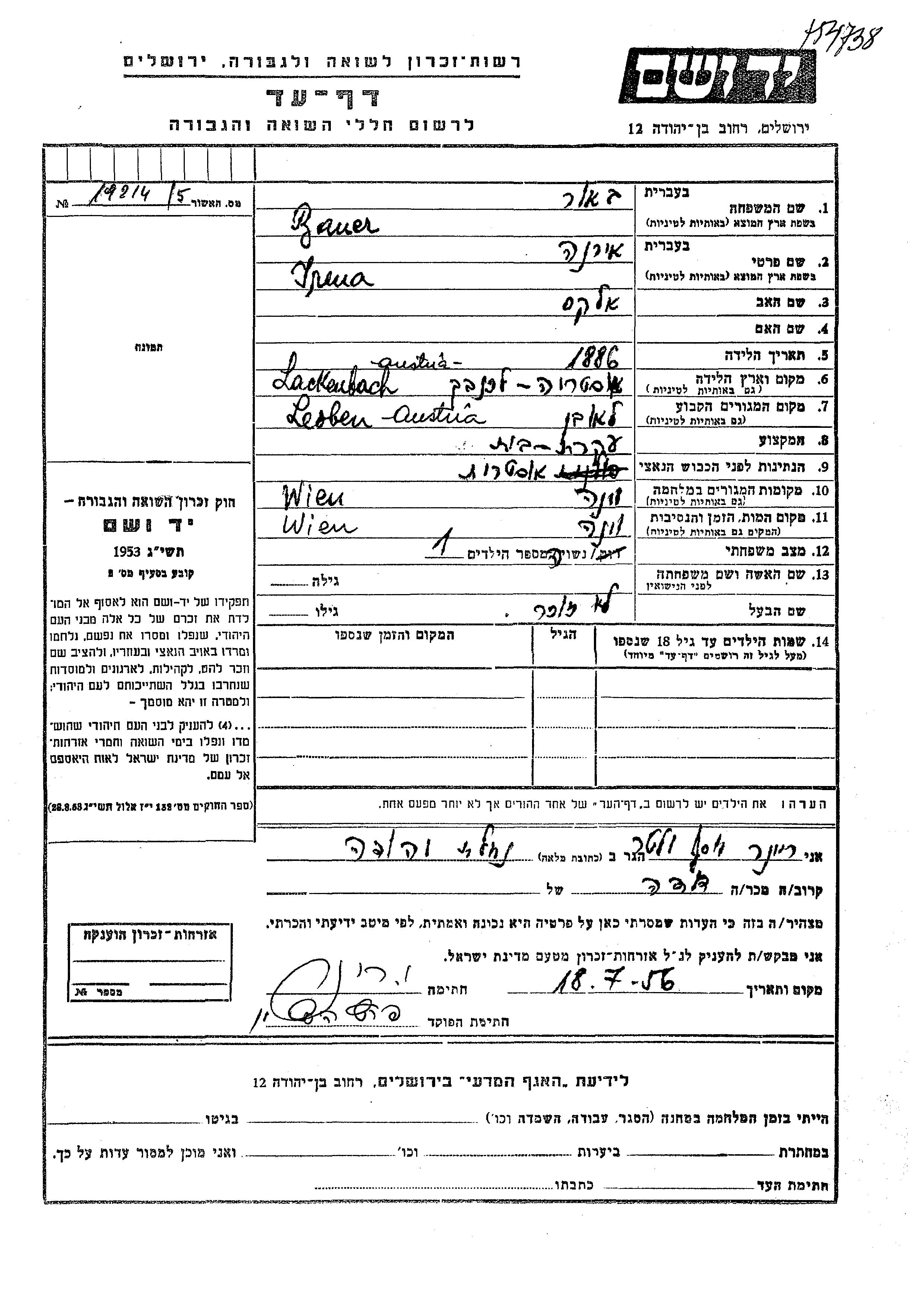 Ирена Баур, место рождения: Лакенбах, Австрия. Отец: Алекс. Домохозяйка. Женат / замужем. Место жительства до войны: Леобен, Австрия. Место во время войны: Вена, Австрия.