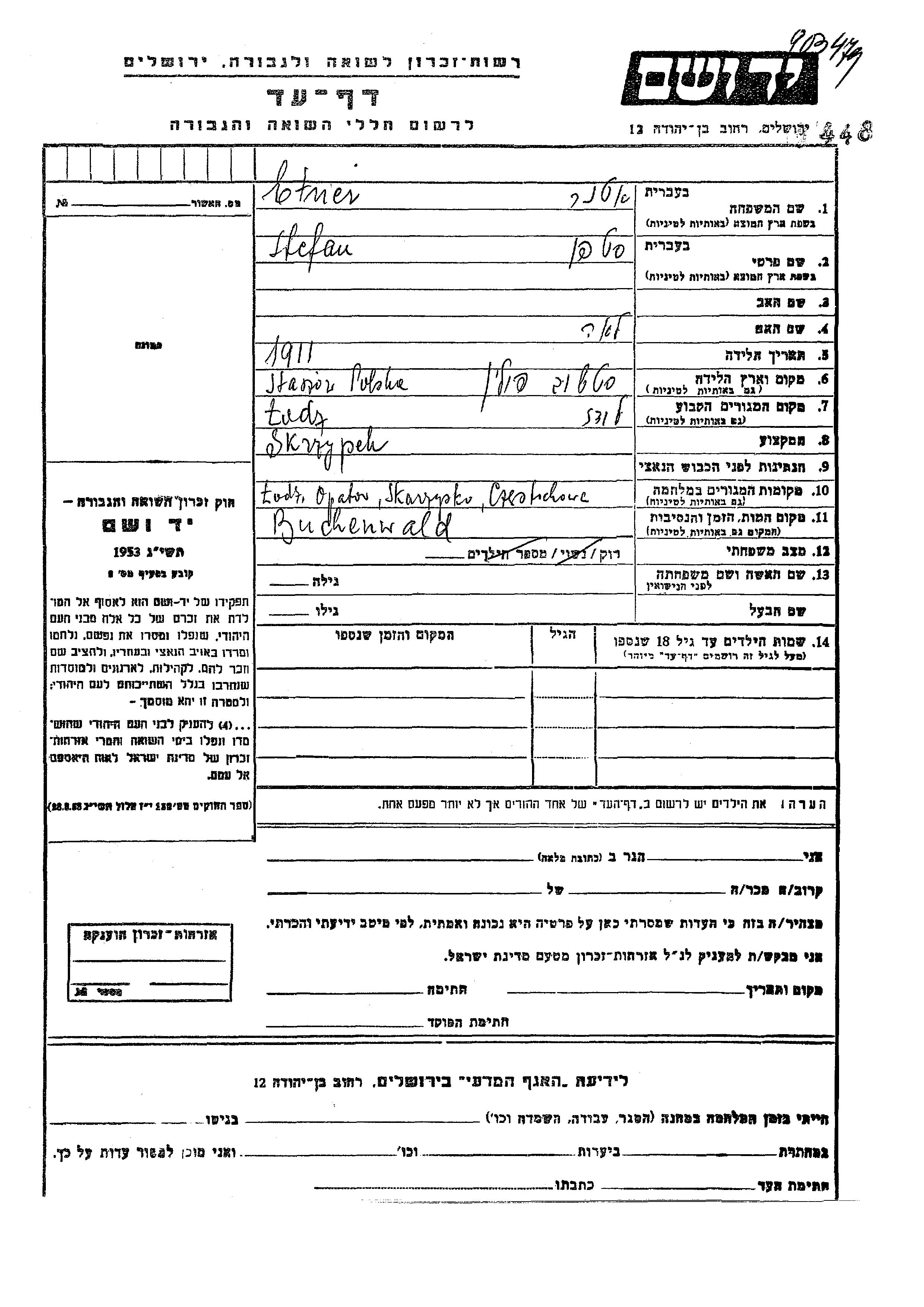 Этнер Стефан 1911 Лодзь, Польша Лист свидетельских показаний