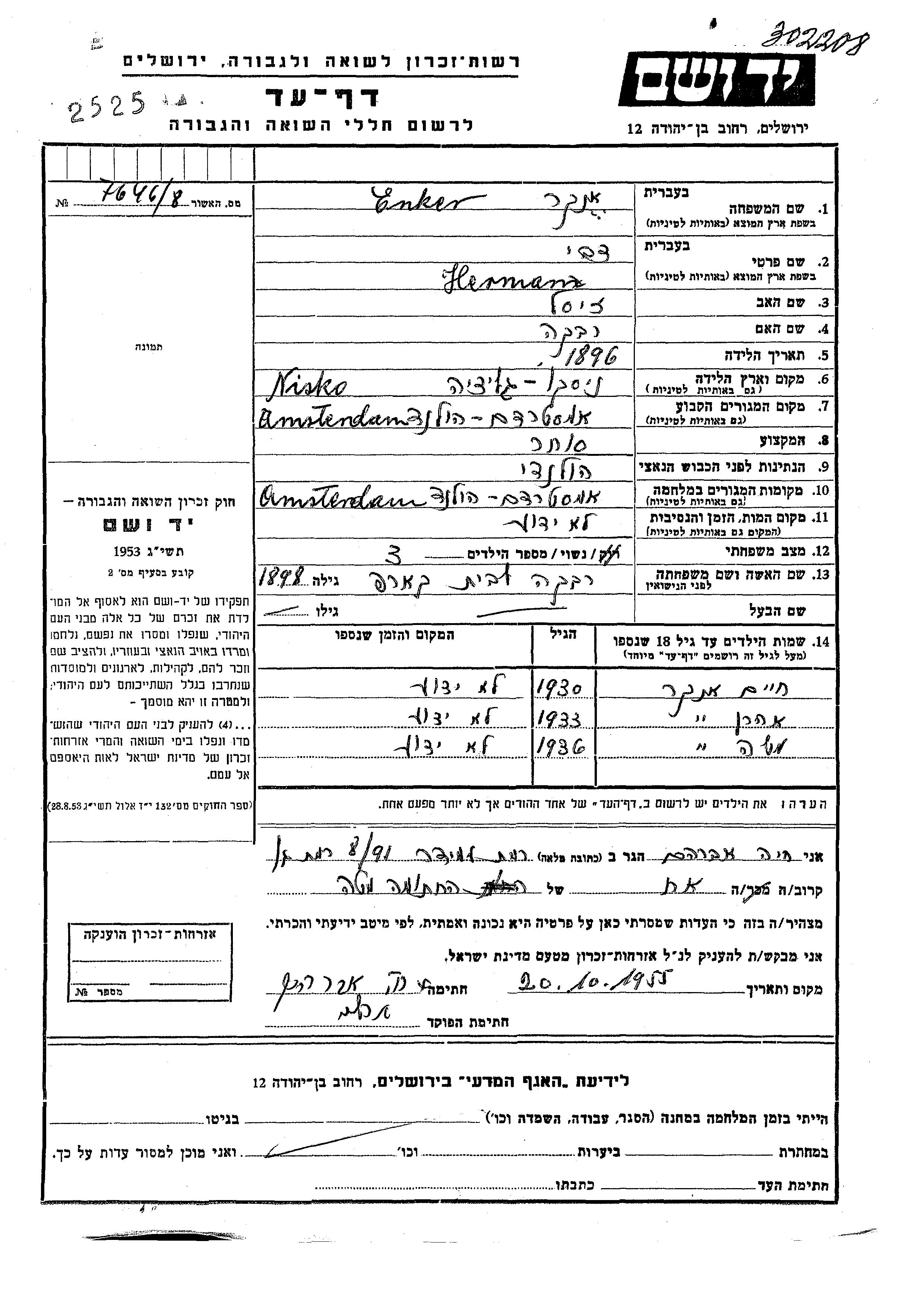 Херман Цви Энкер, место рождения: Ниско, Польша. Отец: Зисл, mать:Ривка. Торговец / торговка. Женат / замужем. Место жительства до войны: Амстердам, Нидерланды. Место во время войны: Амстердам, Нидерланды.