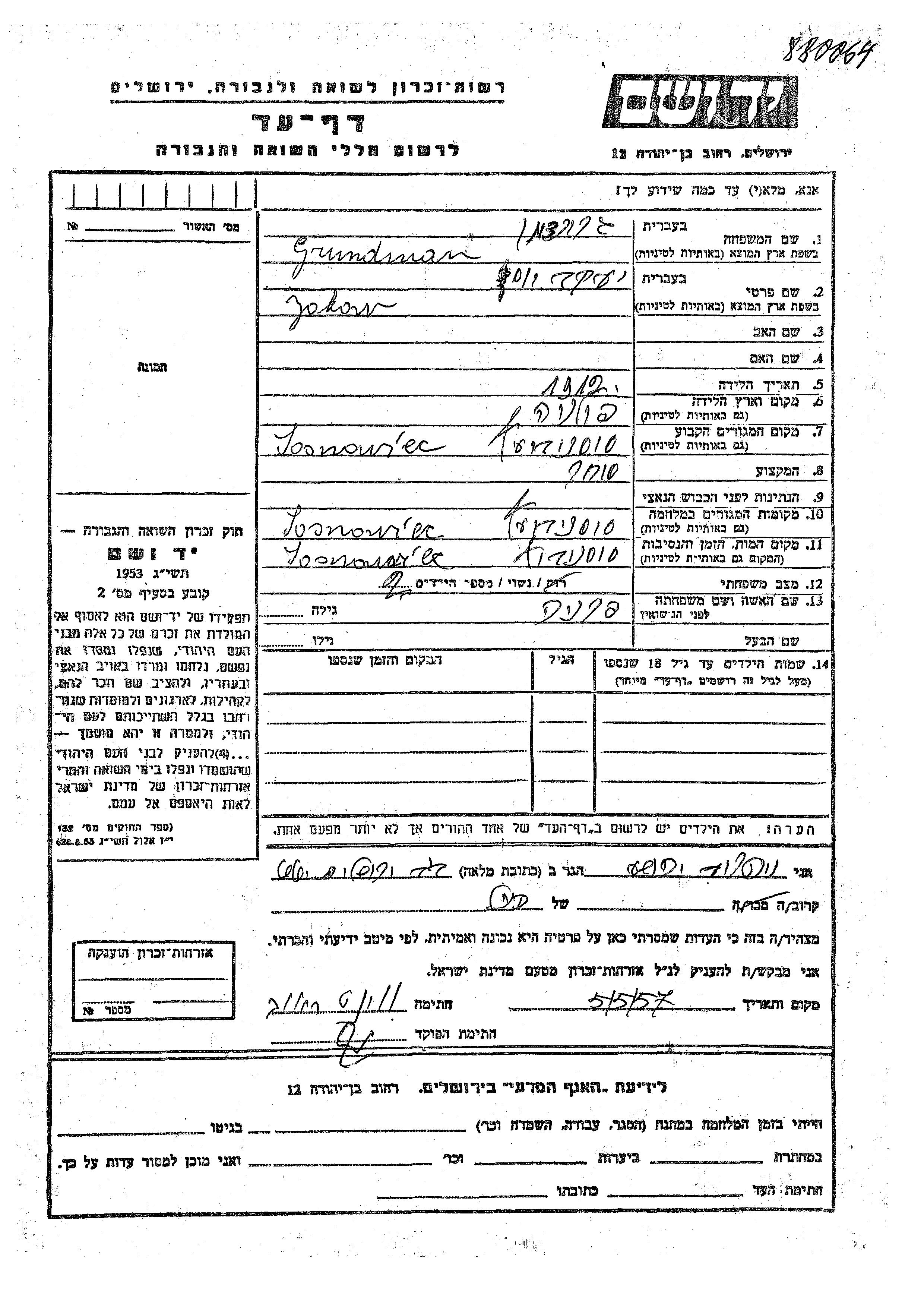 Грундман Яков Иосеф 1912 Сосновец, Польша Лист свидетельских показаний