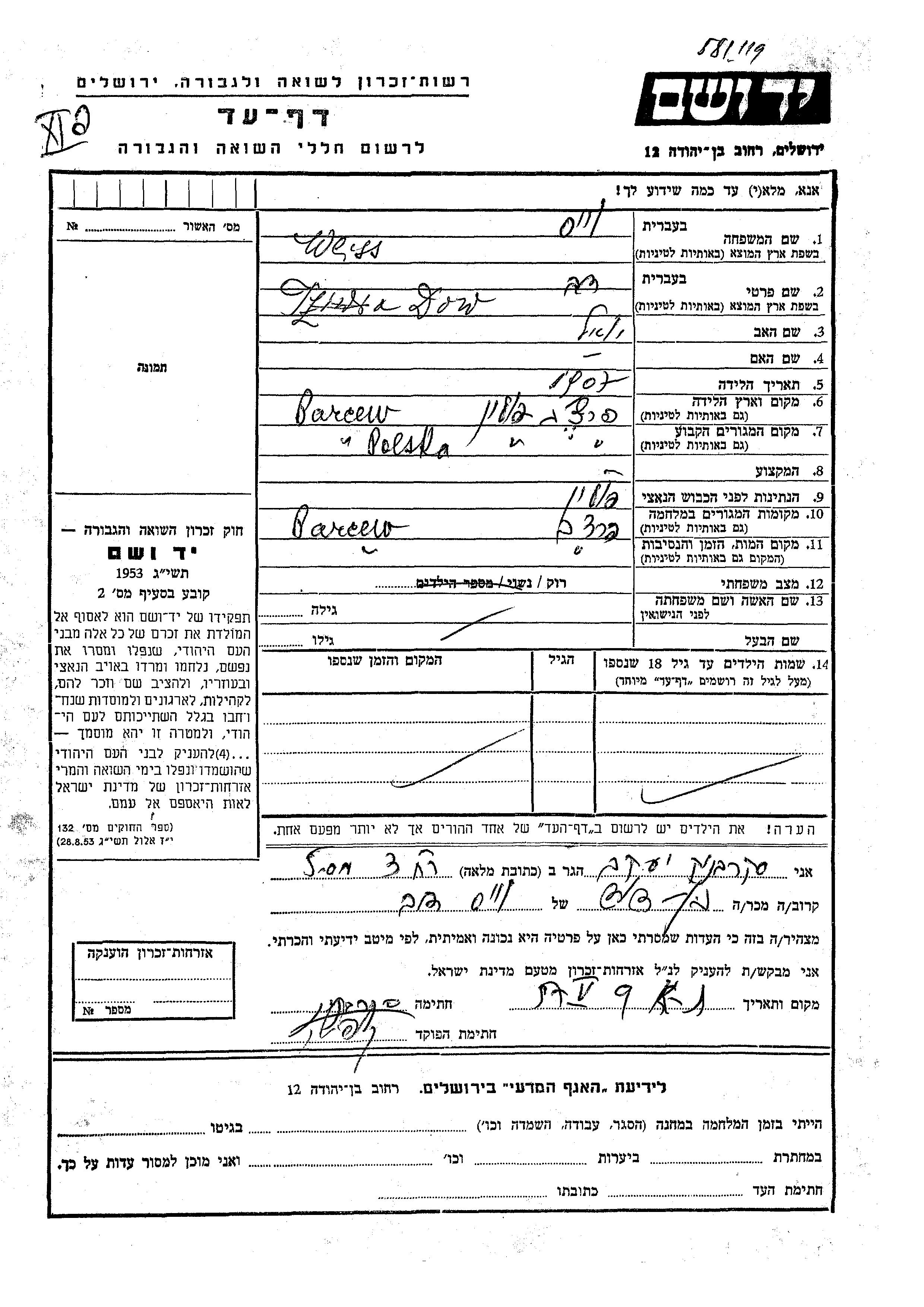 Вайсс Дов 1907 Парчев, Польша Лист свидетельских показаний