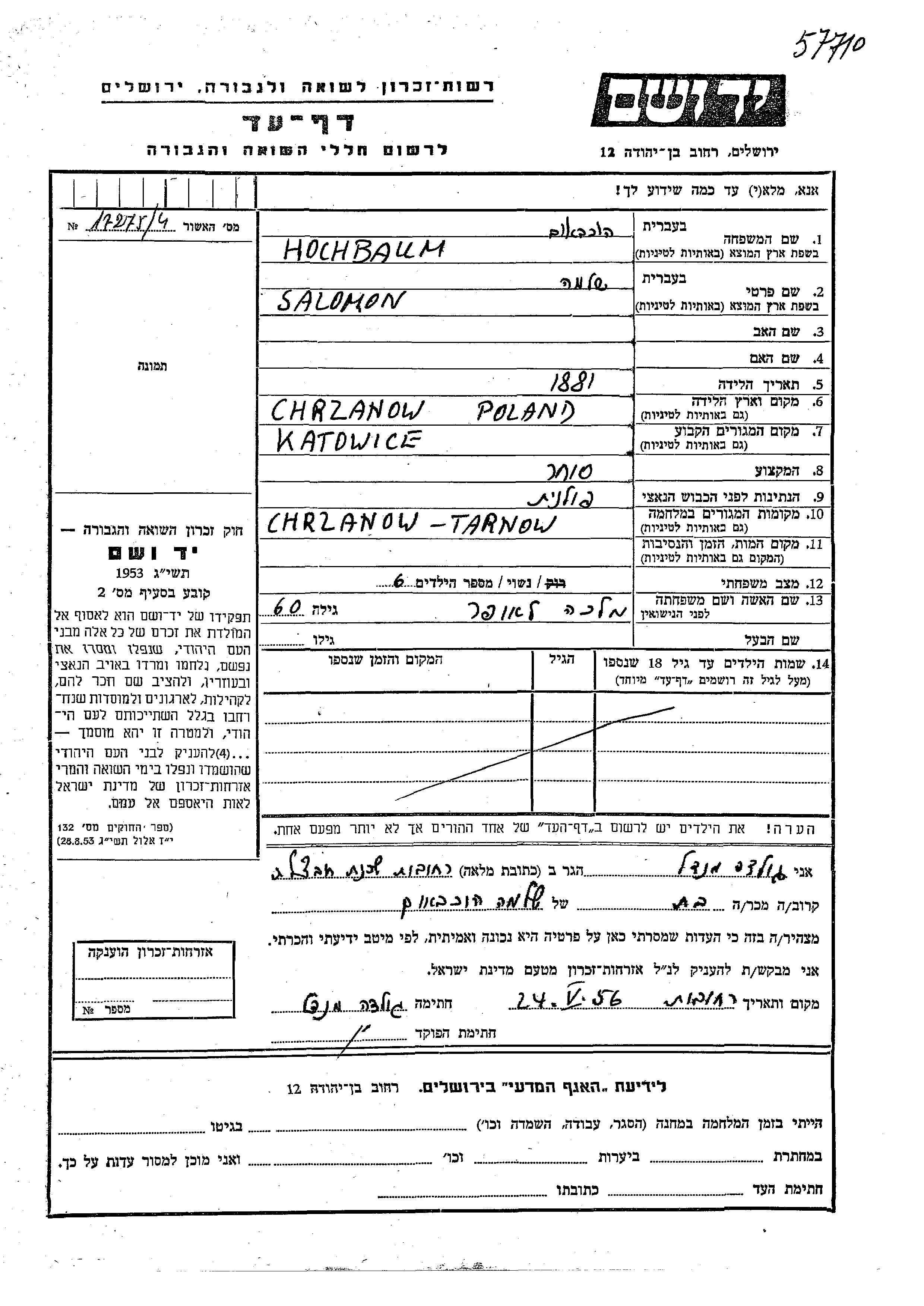 Саломон Хохбаум, место рождения: Хшанув, Польша. Торговец / торговка. Женат / замужем. Место жительства до войны: Катовице, Польша. Место во время войны: Хшанув, Польша.