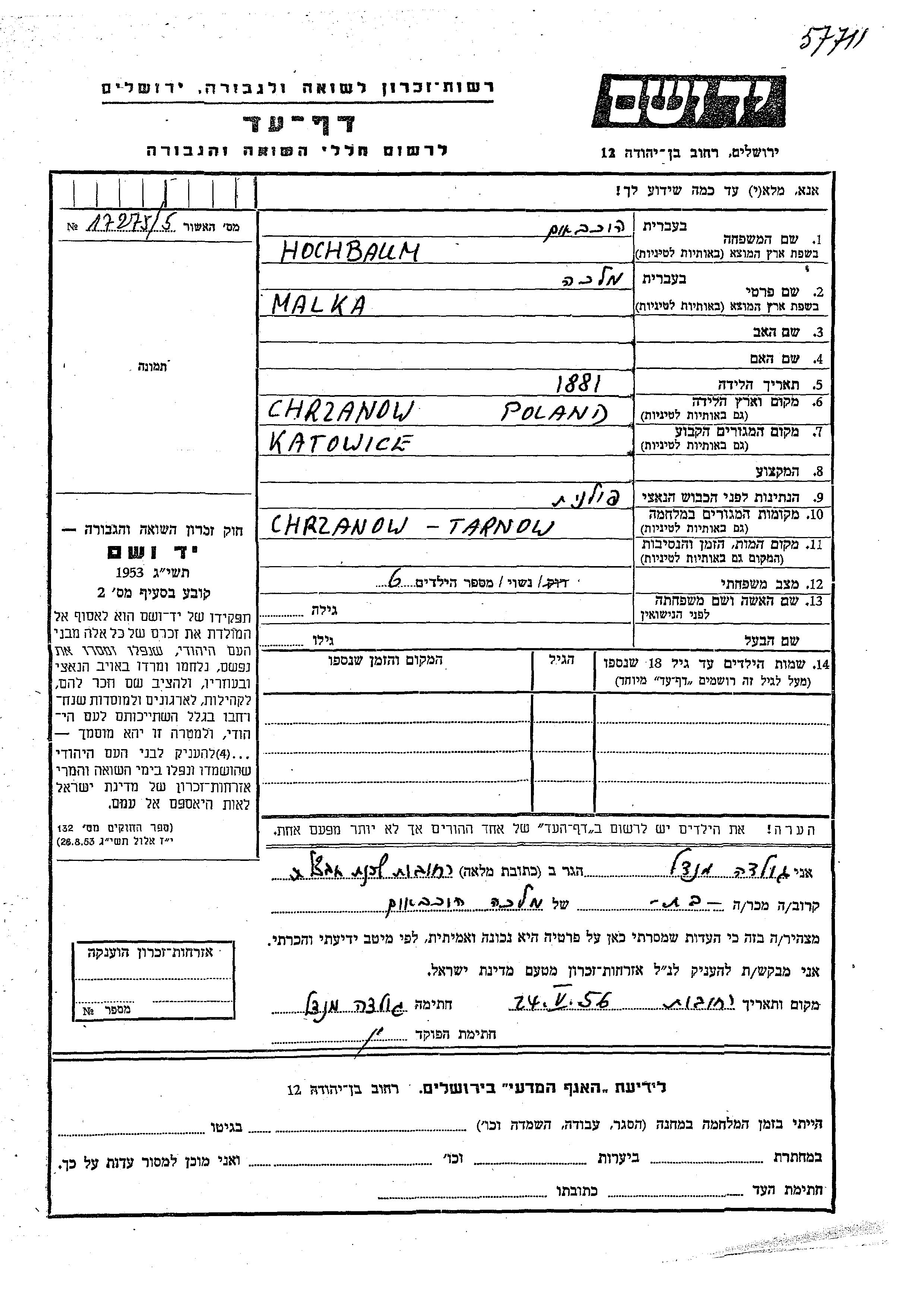 Малка Хохбаум, место рождения: Хшанув, Польша. Женат / замужем. Место жительства до войны: Катовице, Польша. Место во время войны: Хшанув, Польша.