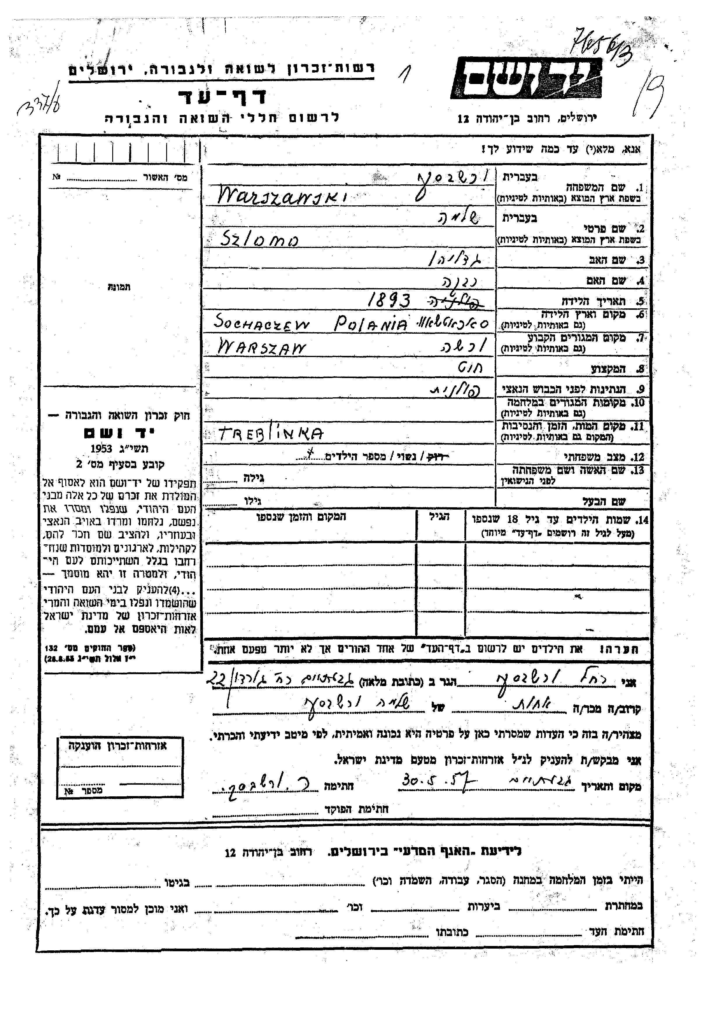 Шломо Варшавский, место рождения: Сохачев, Польша. Отец: Гдальягу, mать:Ривка. Портной / портниха. Женат / замужем. Место жительства до войны: Варшава, Польша.